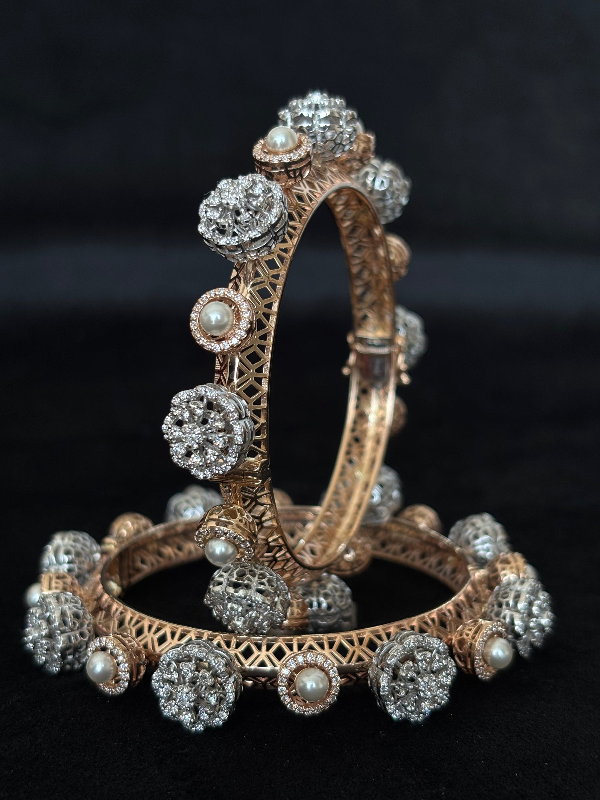 14K gold diamond and pearl bangle bracelets, a true masterpiece of design and craftsmanship. Each bangle features an intricate fusion of textures and elements, showcasing detailed filigree work in warm gold, contrasting white-gold toned sections studded with brilliant diamonds, and elegant pearl accents. The captivating spherical clusters adorned with diamonds and pearls create a rich, multi-dimensional appeal, making these bangles a statement of opulent grace.