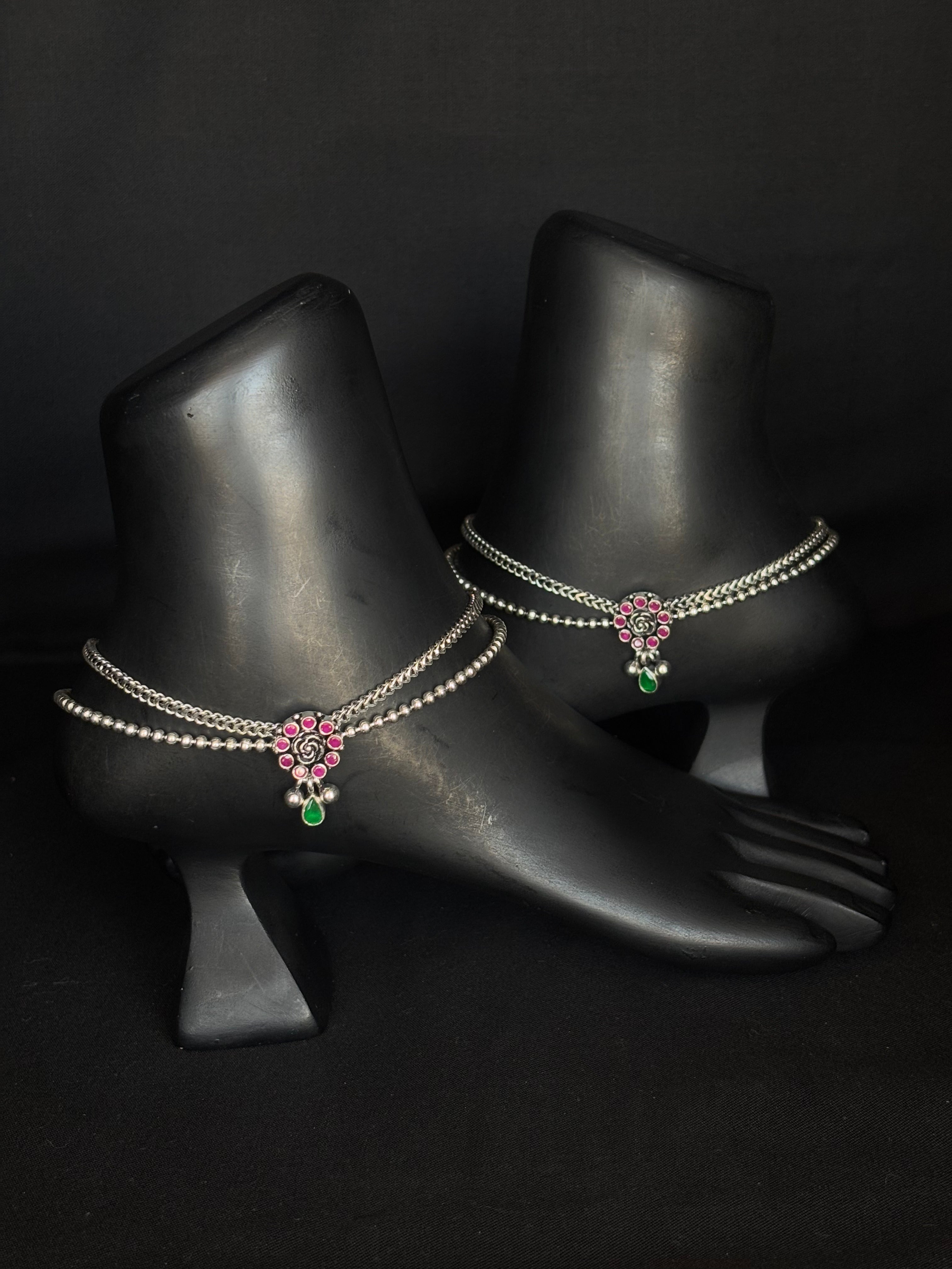 92.5 Sterling Silver Oxidized Anklets with Colorful Stone Accents - Traditional Indian Jewelry