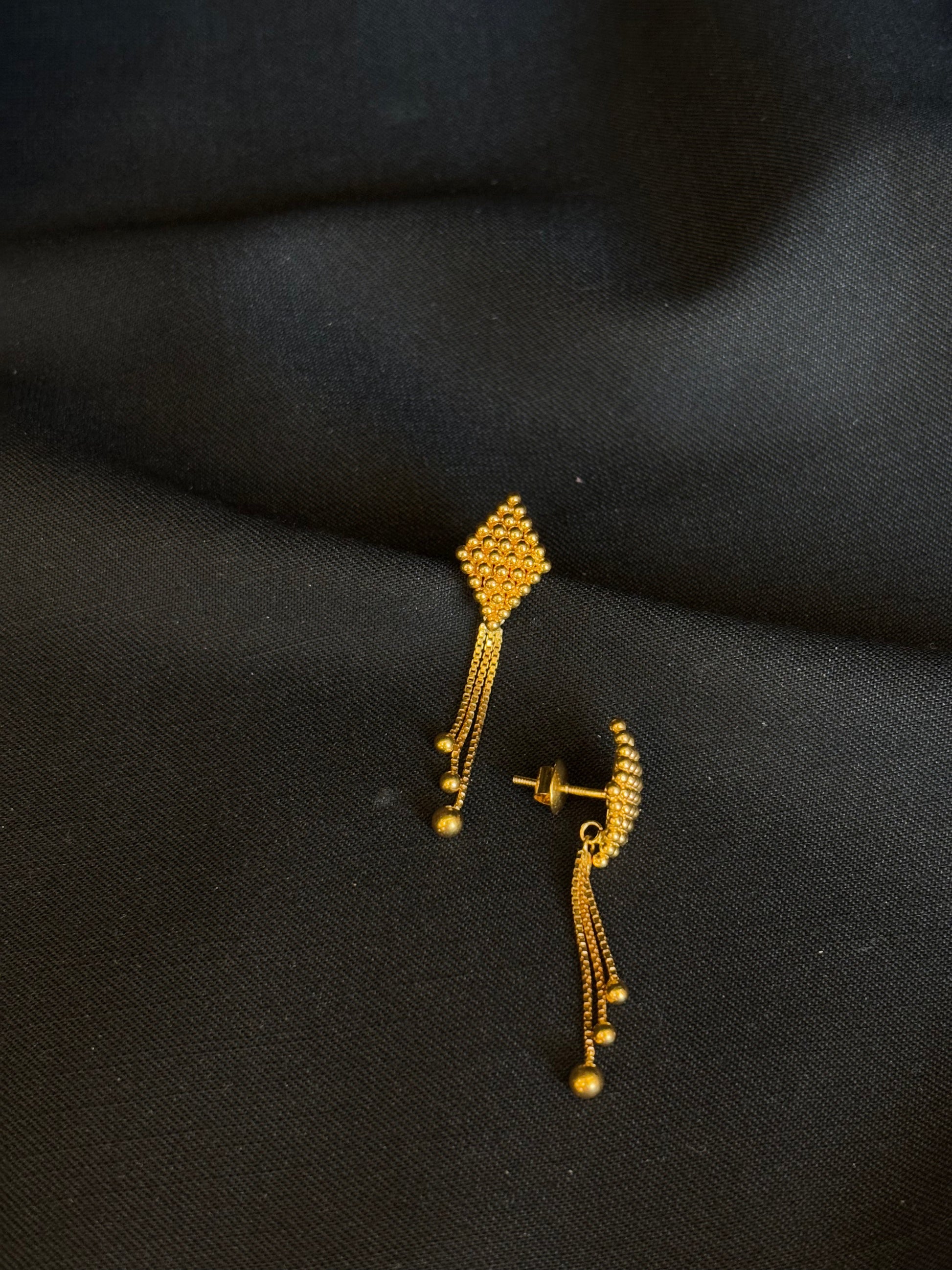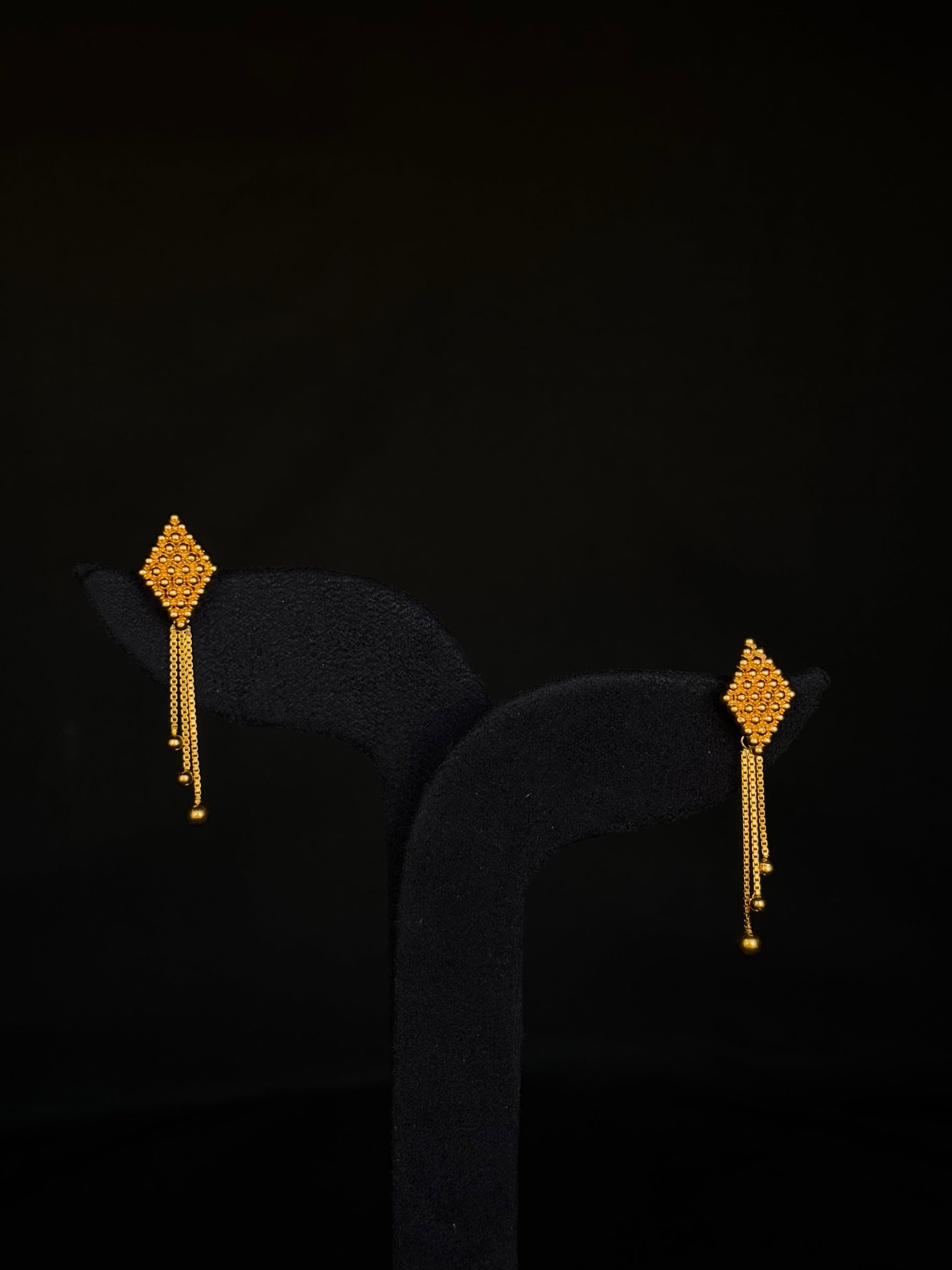 22K Gold Diamond-Shaped Stud & Dangle Earrings. These beautifully crafted earrings feature textured diamond-shaped studs with intricate detailing, leading to delicate chains with small gold beads that add movement and elegance. The rich, warm glow of 22K gold, hallmarked "916" for purity, enhances the exquisite craftsmanship, making them a cherished piece of traditional Indian jewelry.