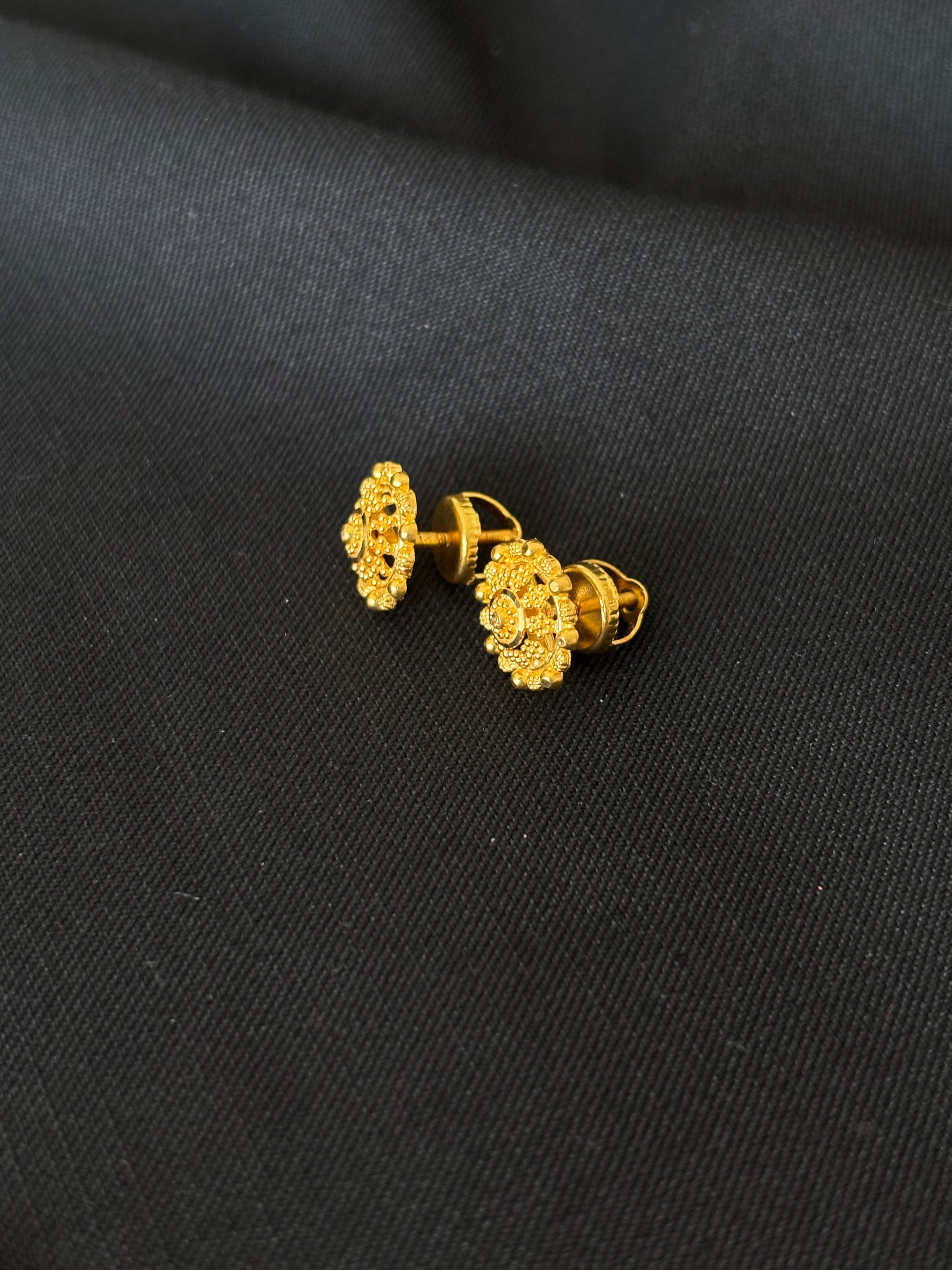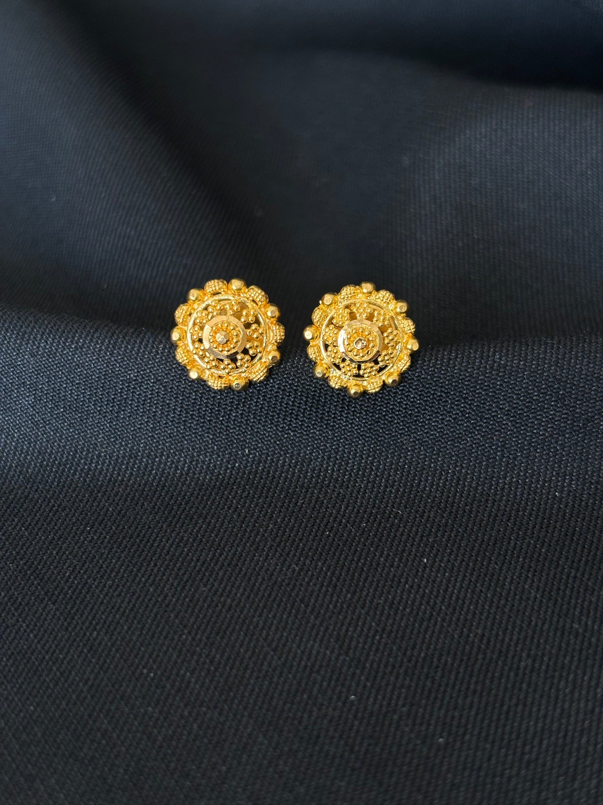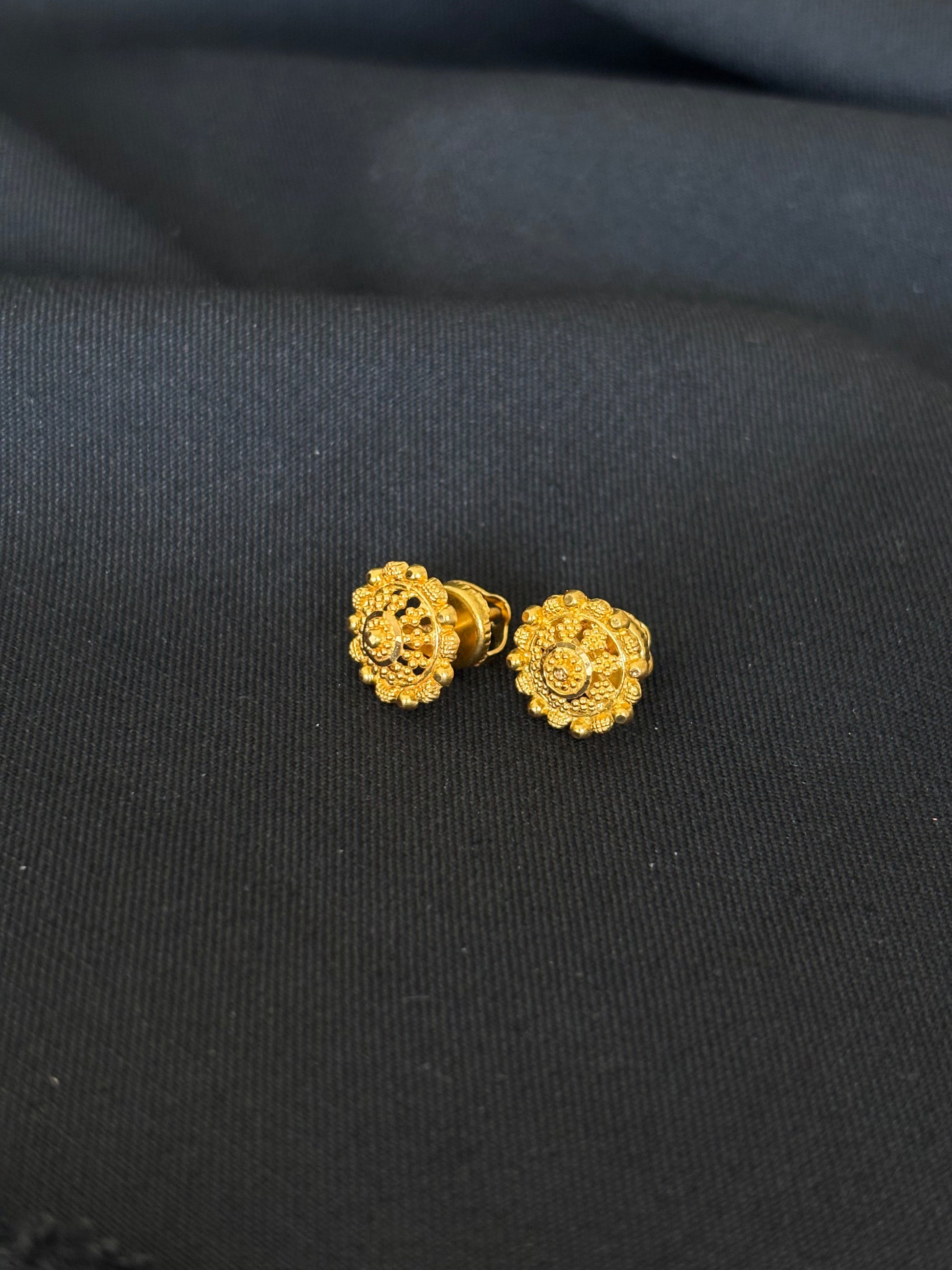 22K yellow gold stud earrings. Each earring features a classic domed or circular shape with a captivating intricate pattern, possibly resembling filigree or fine wirework. These versatile and radiant studs are perfect for adding a touch of golden elegance to any outfit.