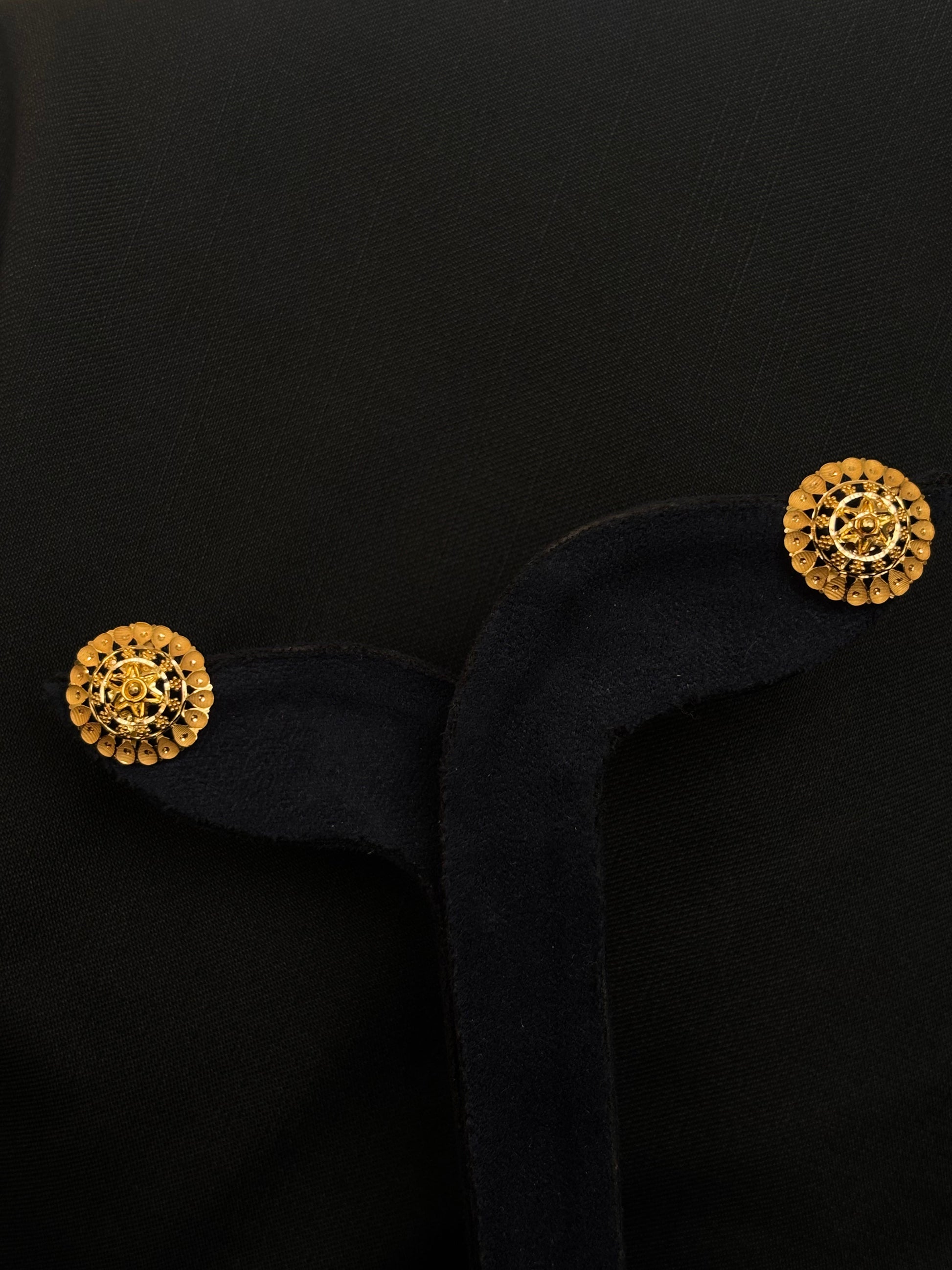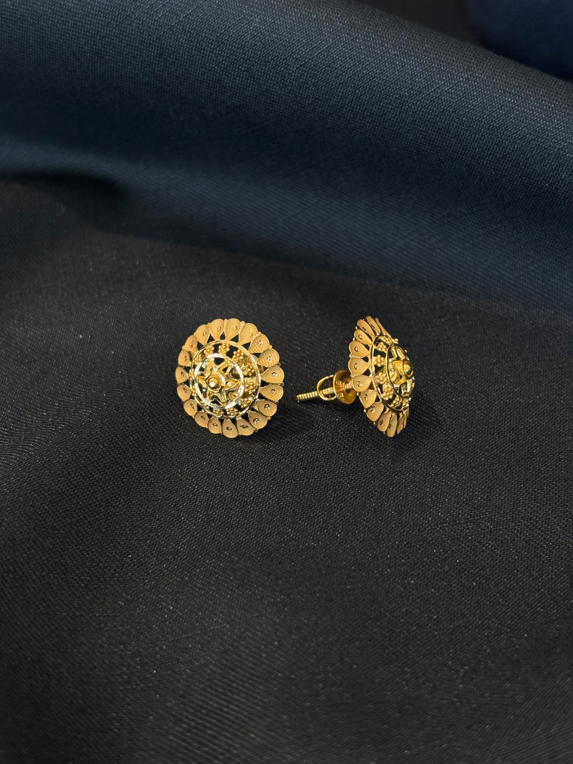 22K yellow gold stud earrings. Each earring features a classic domed or circular shape with a captivating central radial pattern, surrounded by intricate textures or engravings. These versatile and radiant studs are perfect for adding a touch of golden elegance to any outfit.
