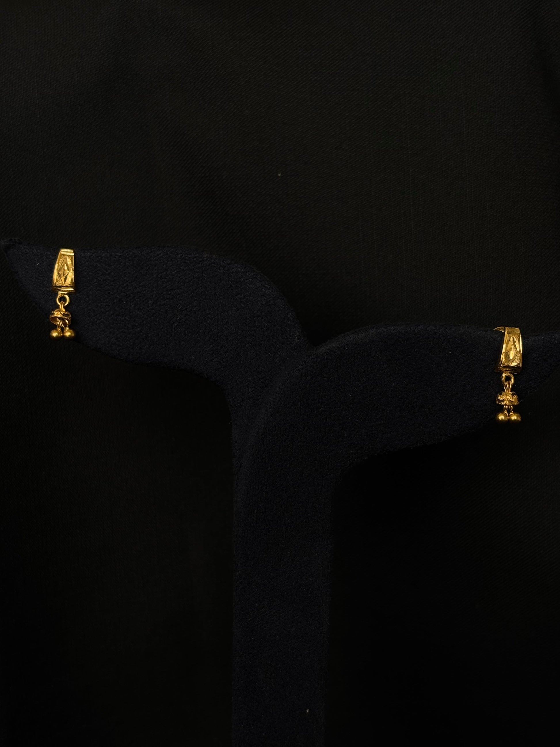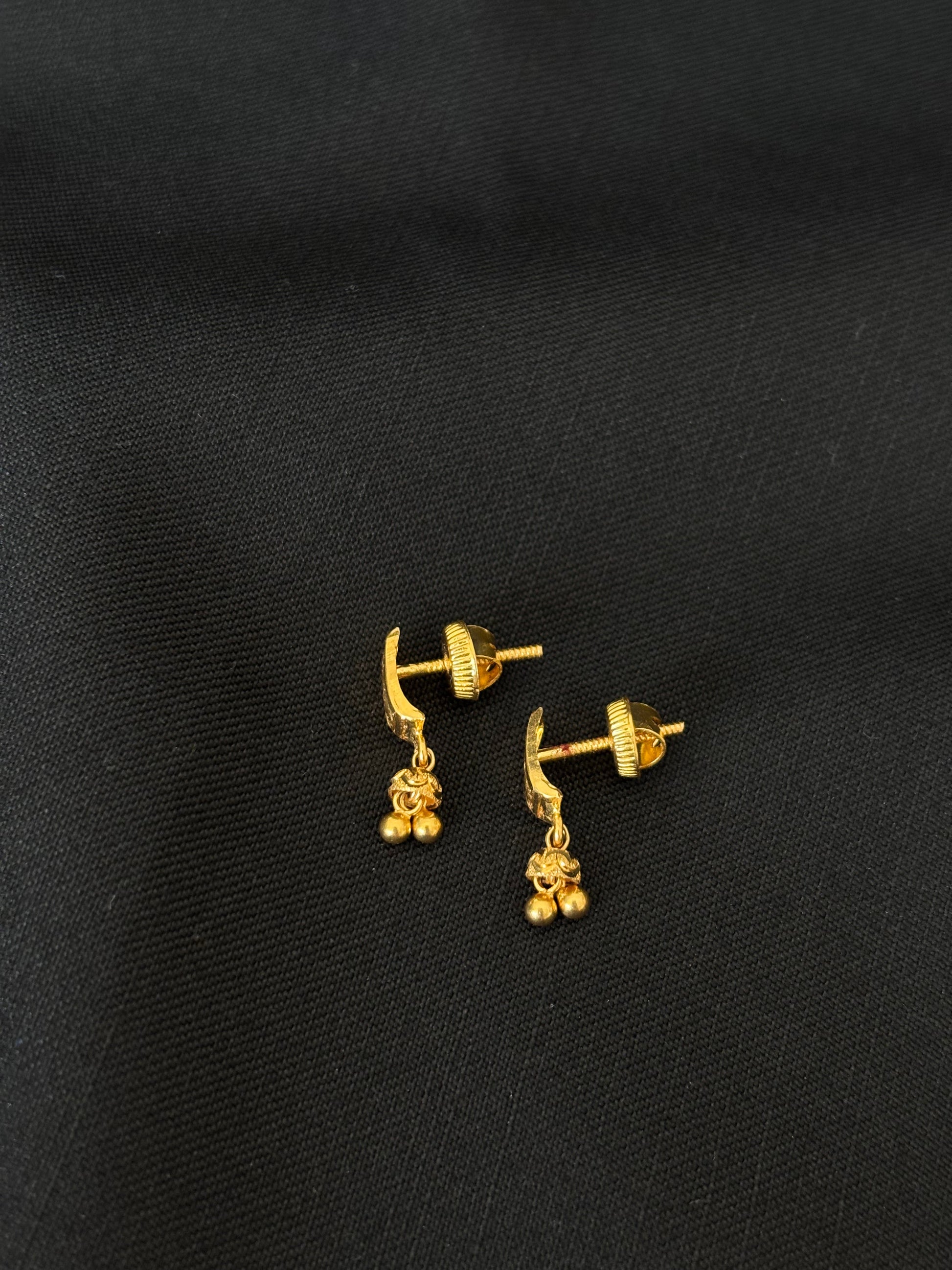 22K yellow gold drop earrings. Each earring features a sleek, textured top from which delicate gold drops gently sway, offering a subtle yet captivating sparkle perfect for everyday wear or a special occasion.