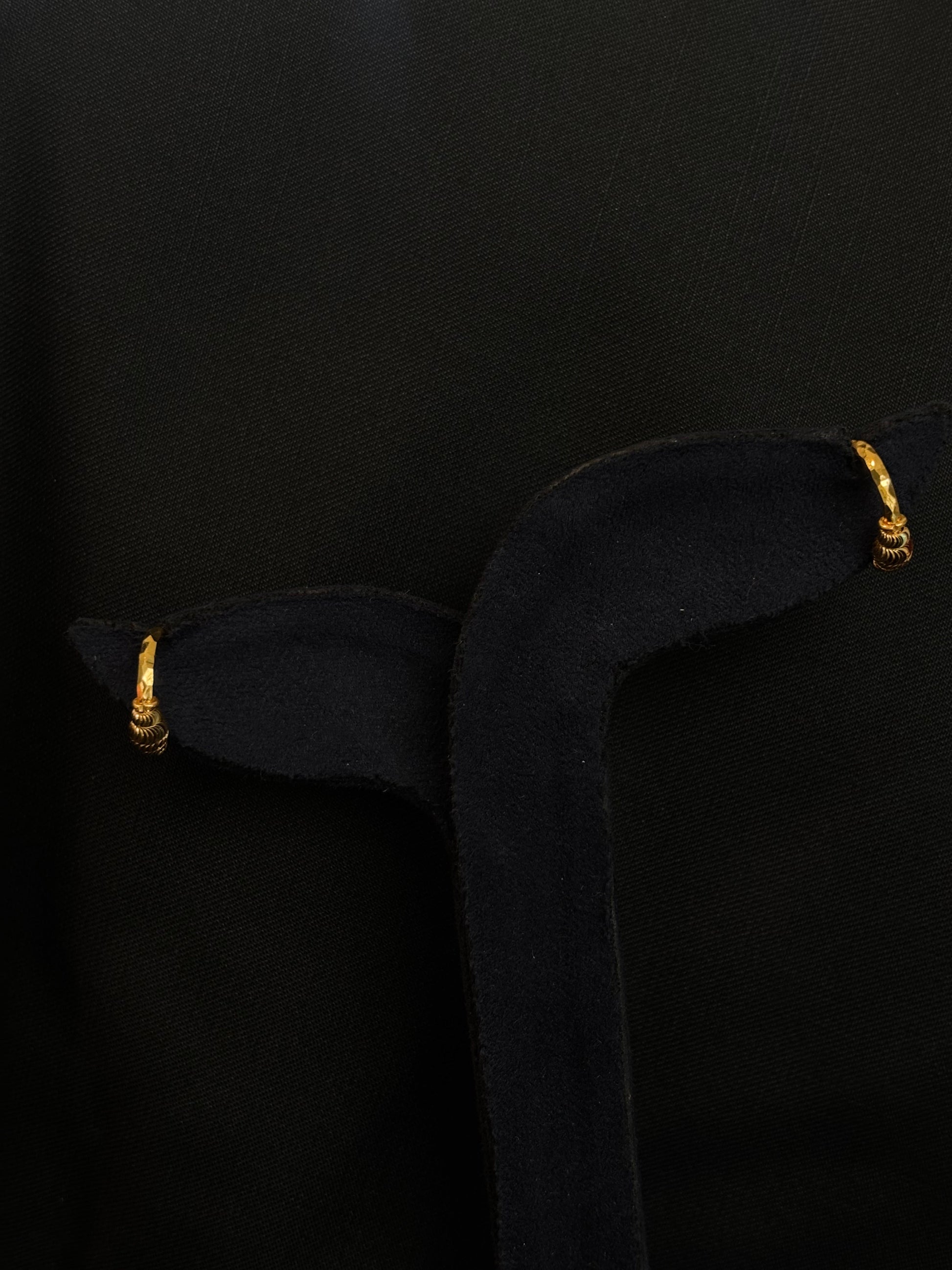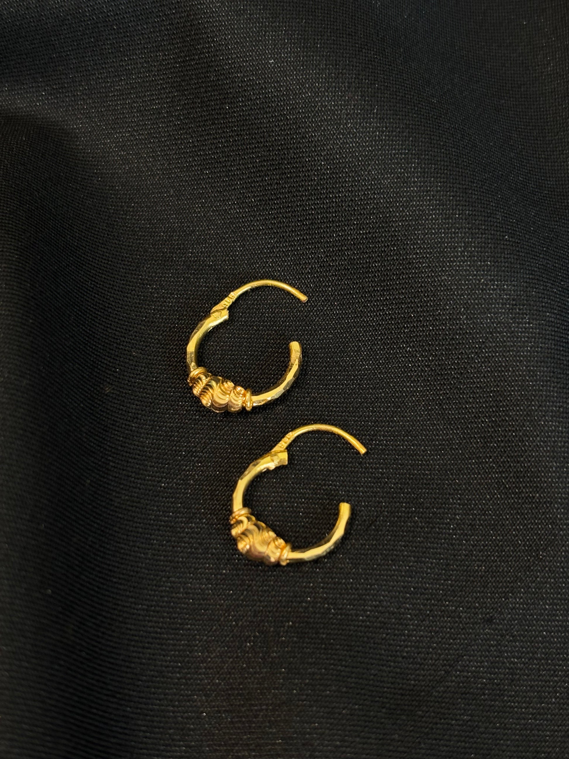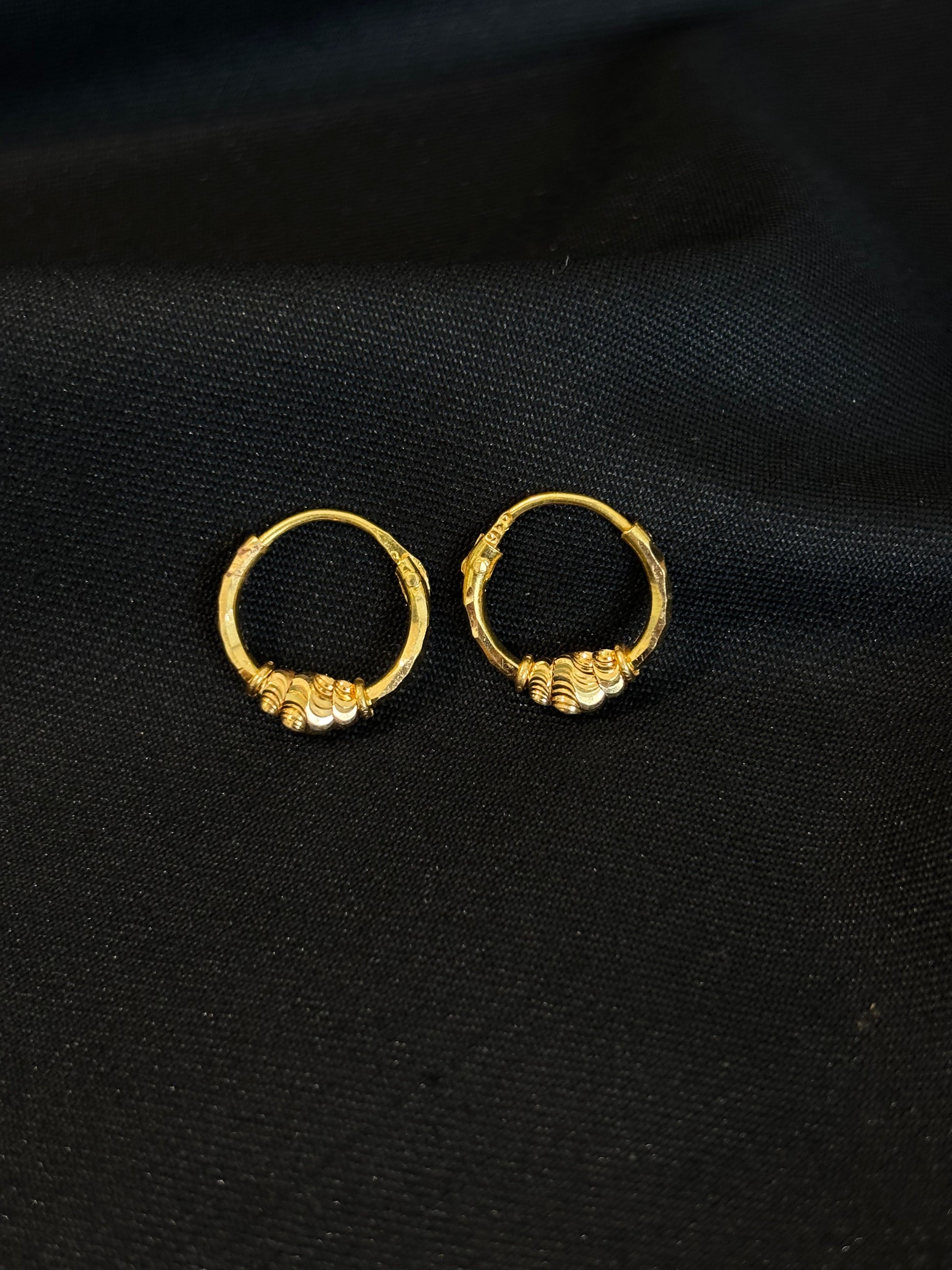 22K yellow gold hoop earrings. Each earring features a contemporary textured finish on the hoop, complemented by a delicate dangling element with small gold beads. These versatile earrings offer a subtle yet radiant touch of gold, perfect for any occasion.
