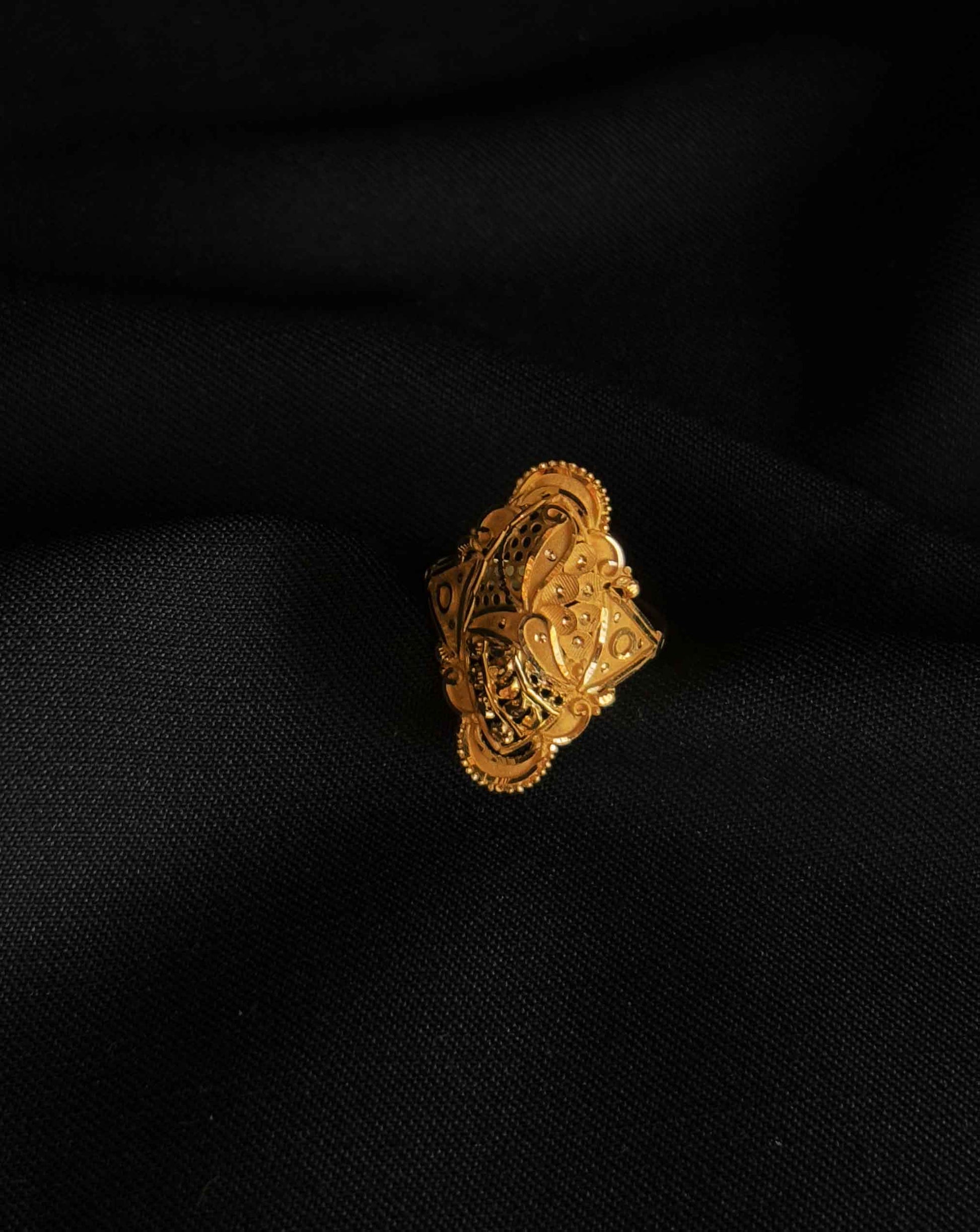 22K gold statement ring. Designed with intricate filigree detailing, this piece exudes elegance and sophistication. The unique craftsmanship makes it an ideal accessory for special occasions or as a timeless addition to your jewelry collection.
