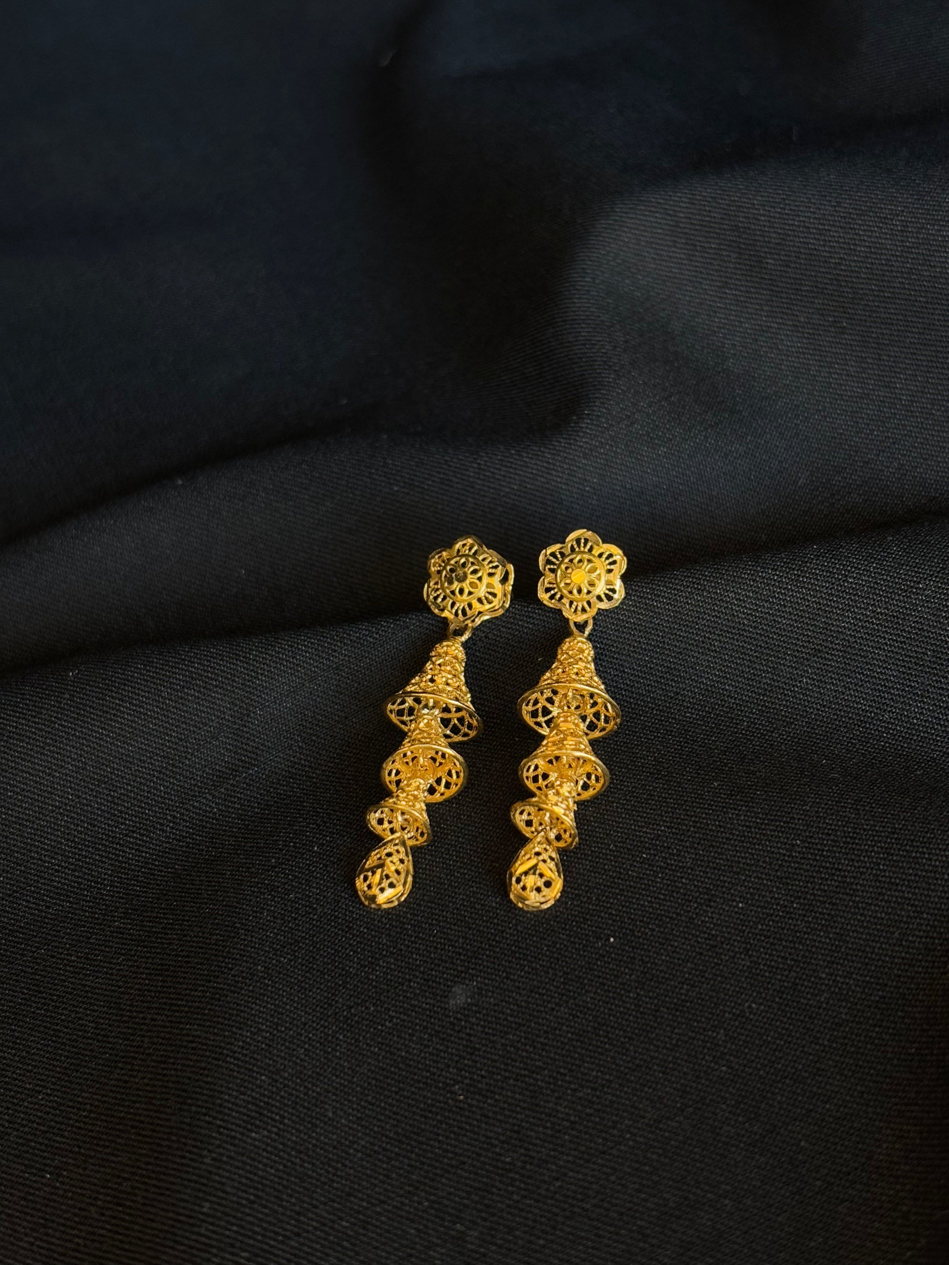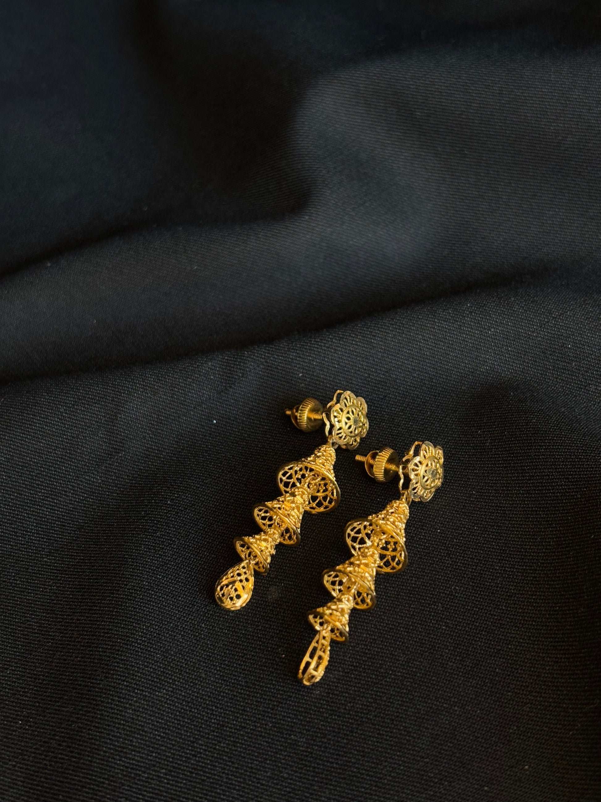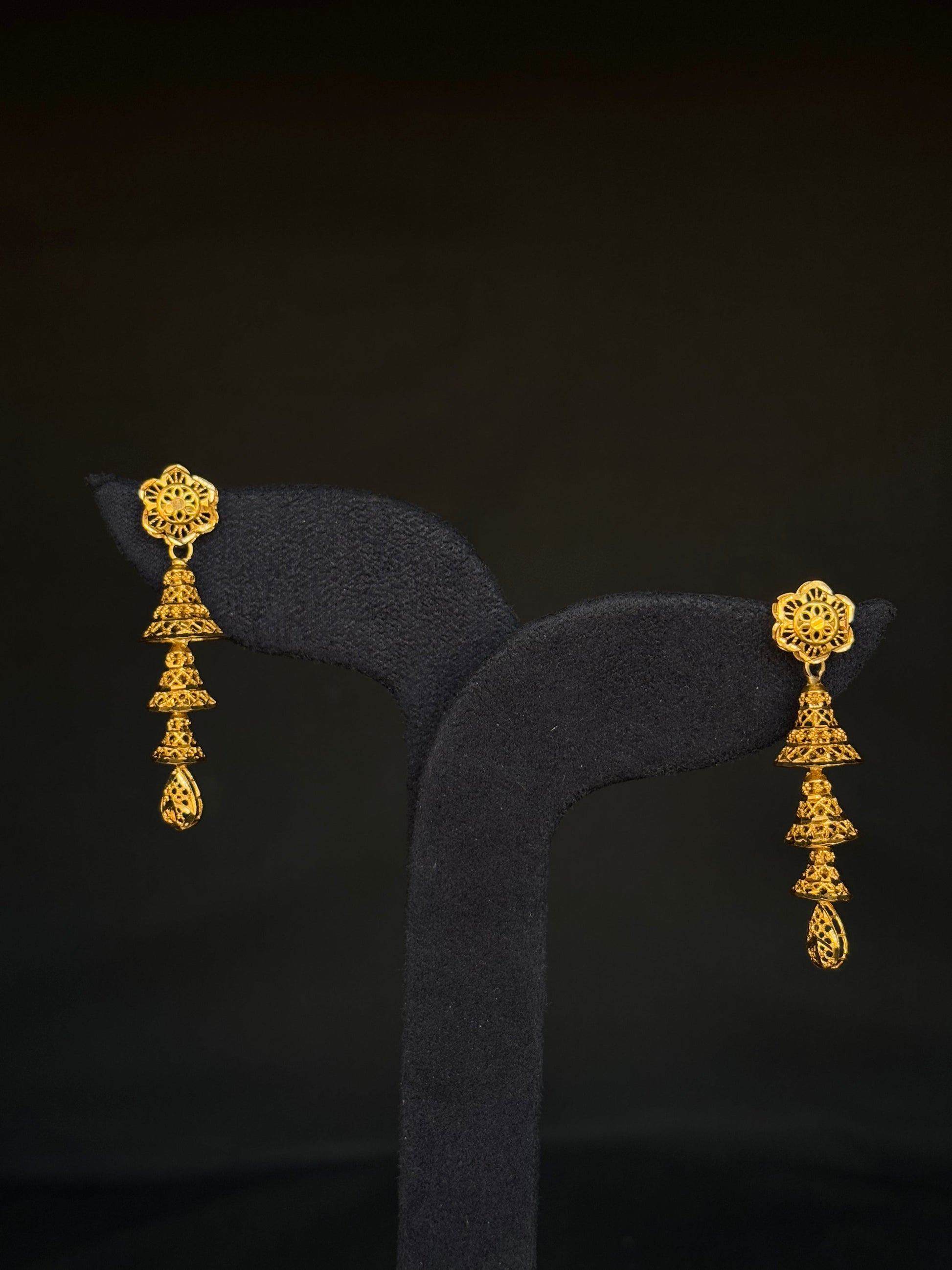 22K Gold Floral Jhumka Earrings. These beautifully crafted earrings feature delicate flower-shaped studs with intricate filigree work, leading to a tiered jhumka design with multiple layers of detailed filigree. The rich, warm glow of 22K gold, hallmarked "916" for purity, enhances the exquisite craftsmanship, making them a cherished piece of traditional Indian jewelry.