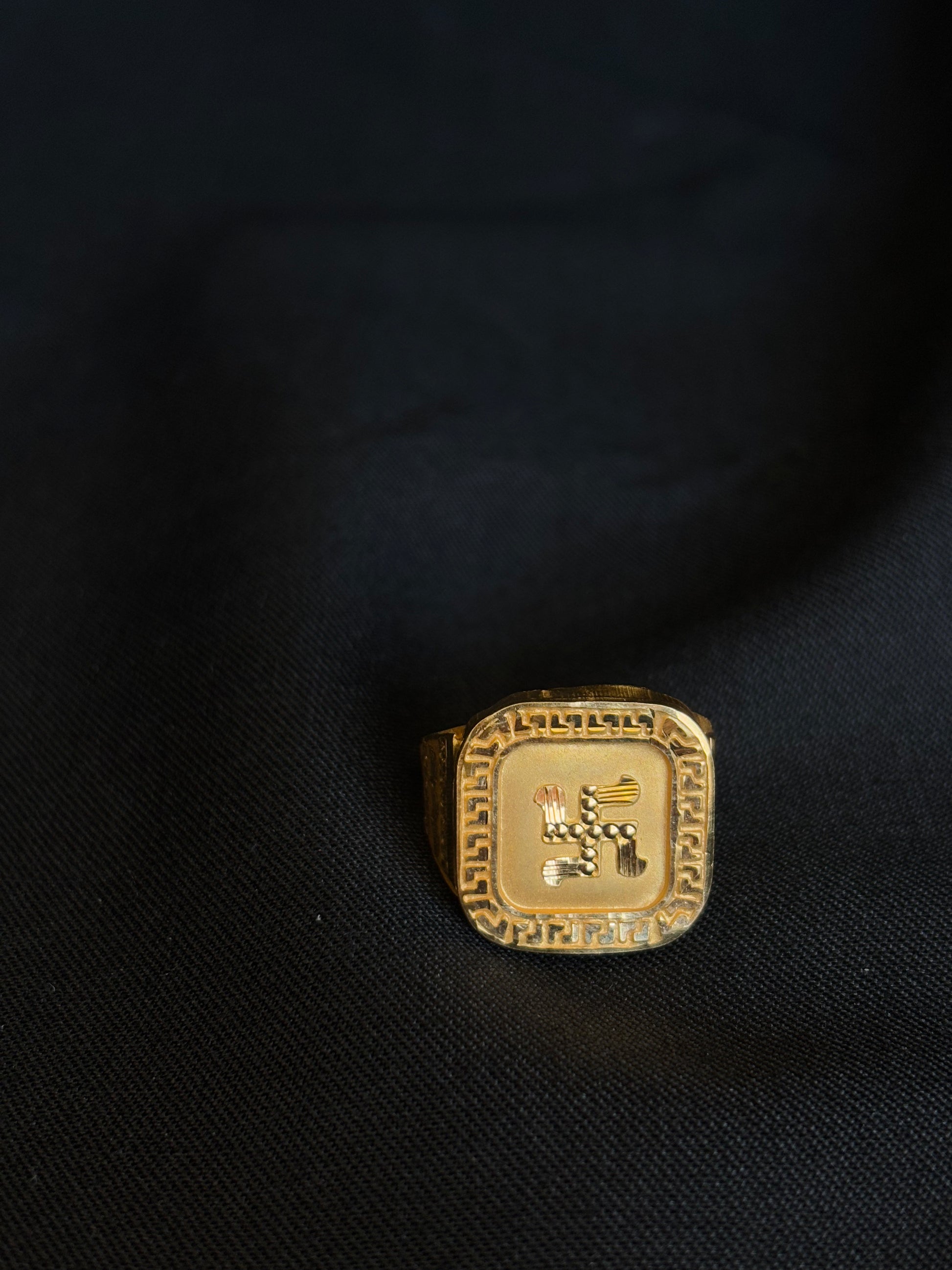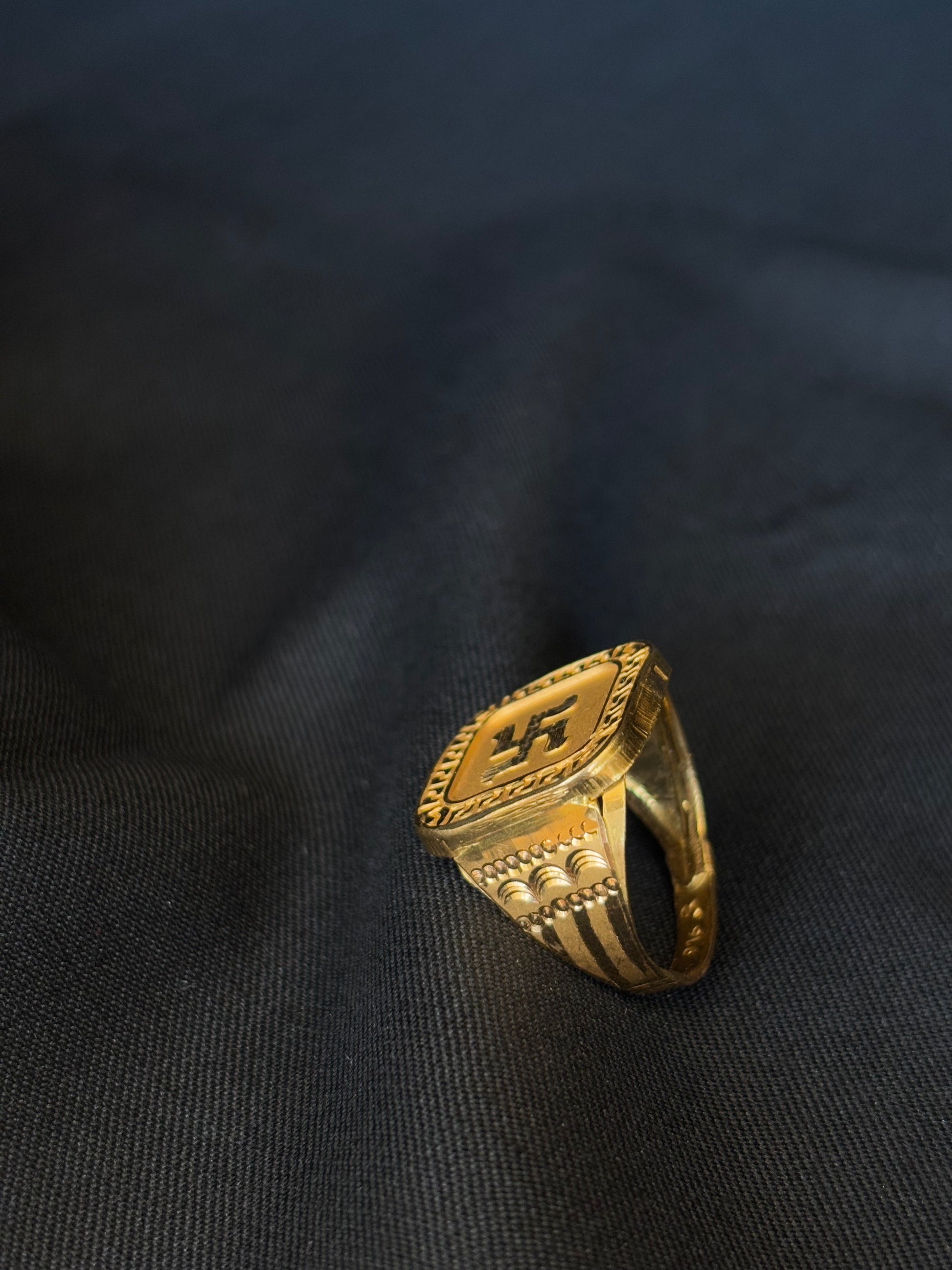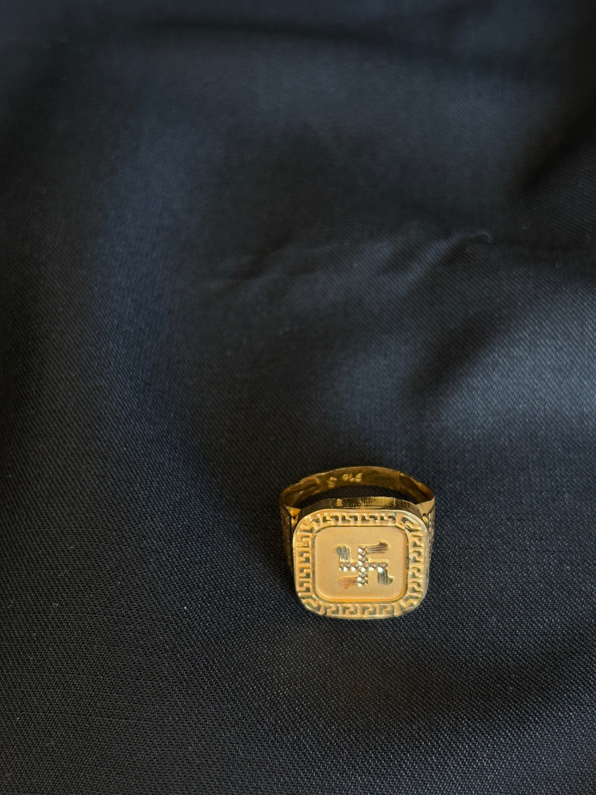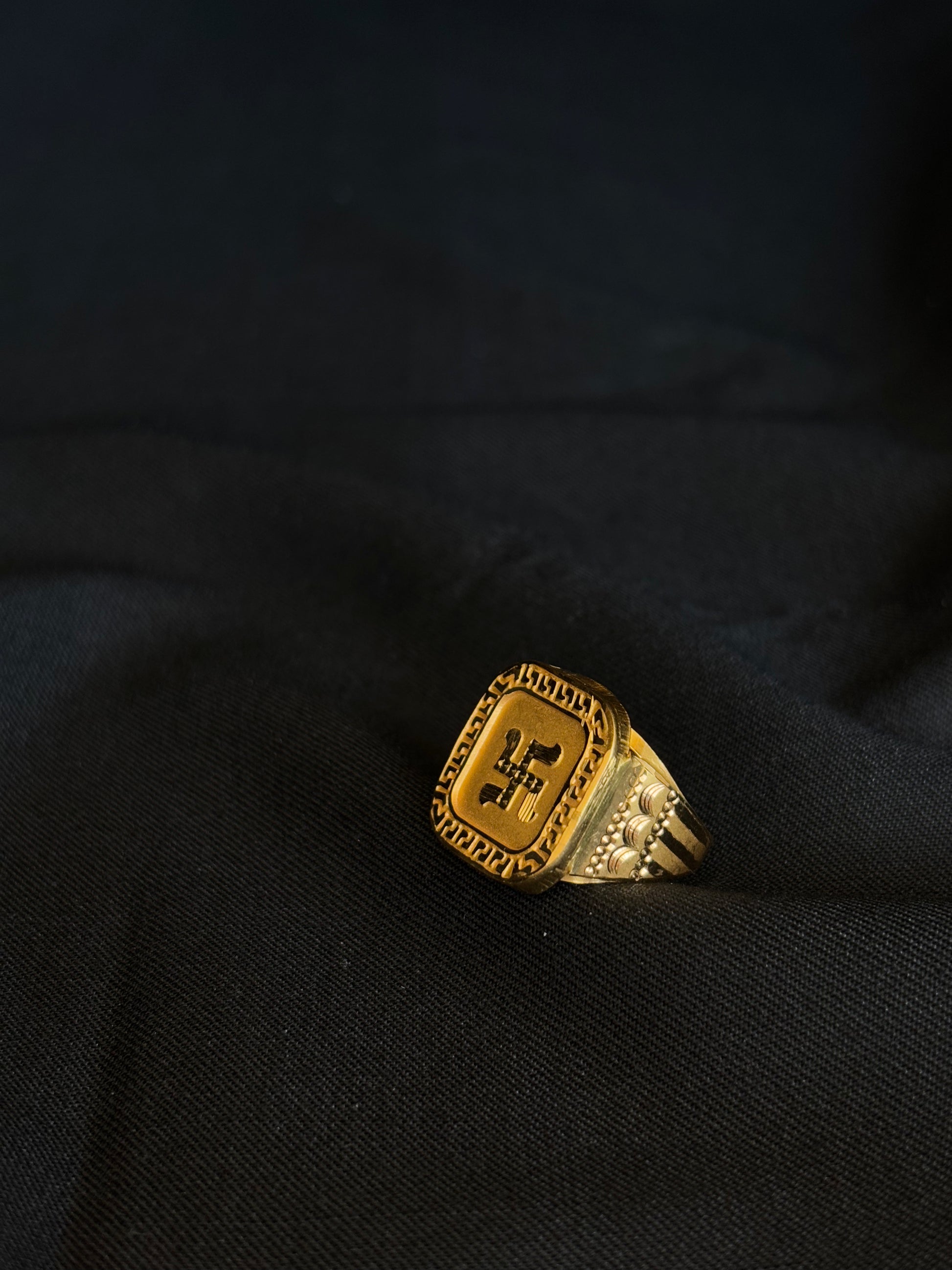 22K gold ring features an Swastik symbol of auspiciousness and well-being, framed by a unique patterned border. A striking piece that blends cultural significance with distinctive design.