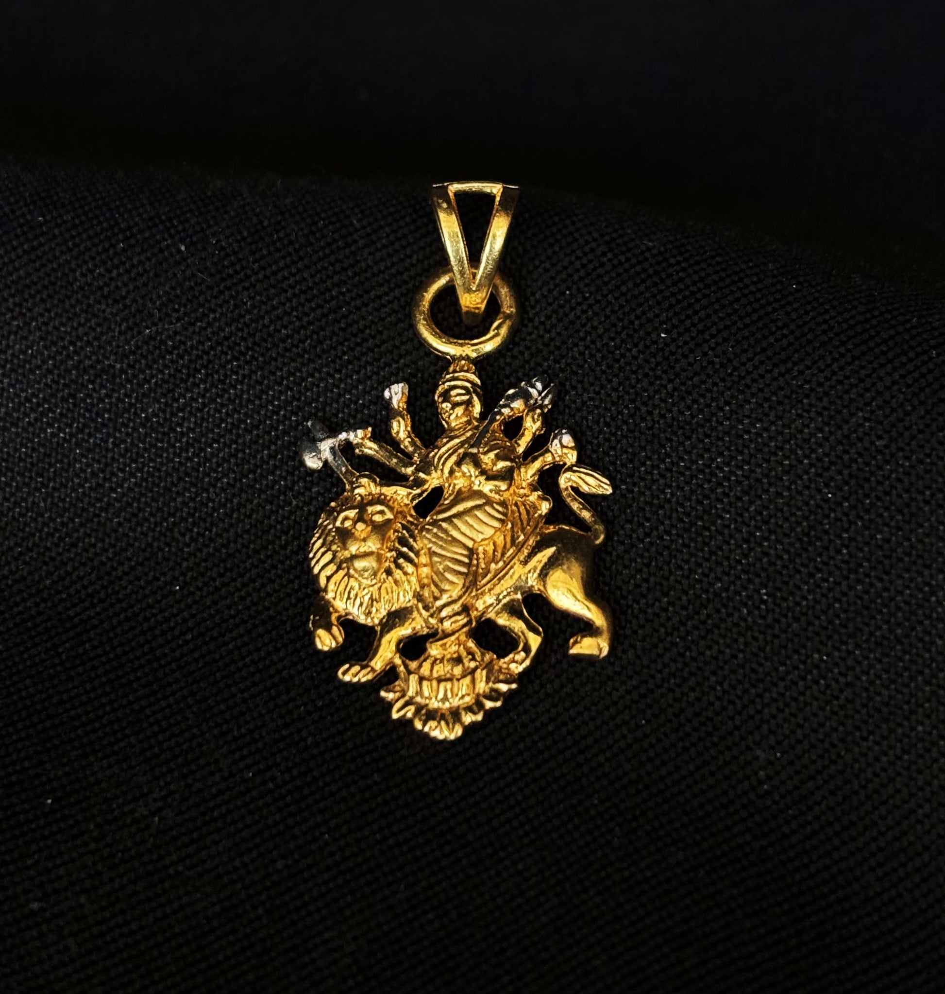 22K gold Goddess Durga pendant. Crafted with intricate detailing, it showcases the powerful depiction of Maa Durga riding her lion. Perfect for spiritual seekers and devotees, this lightweight yet elegant pendant brings blessings and positivity wherever you go.