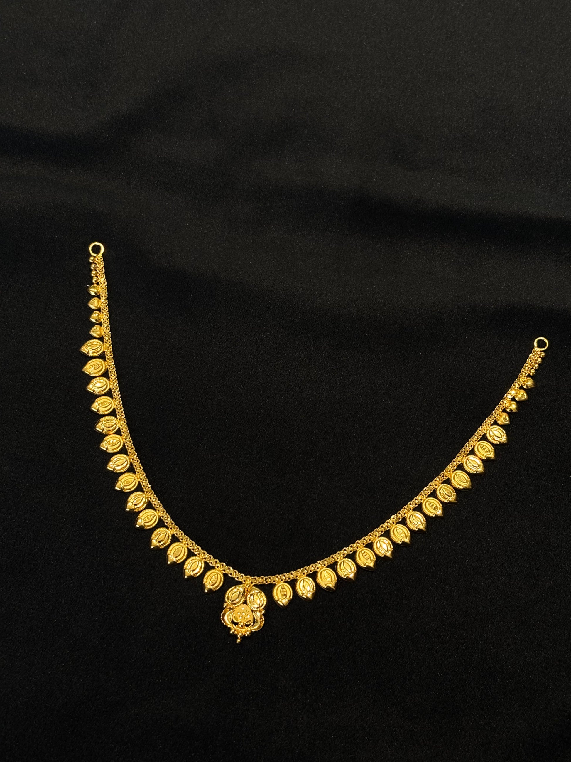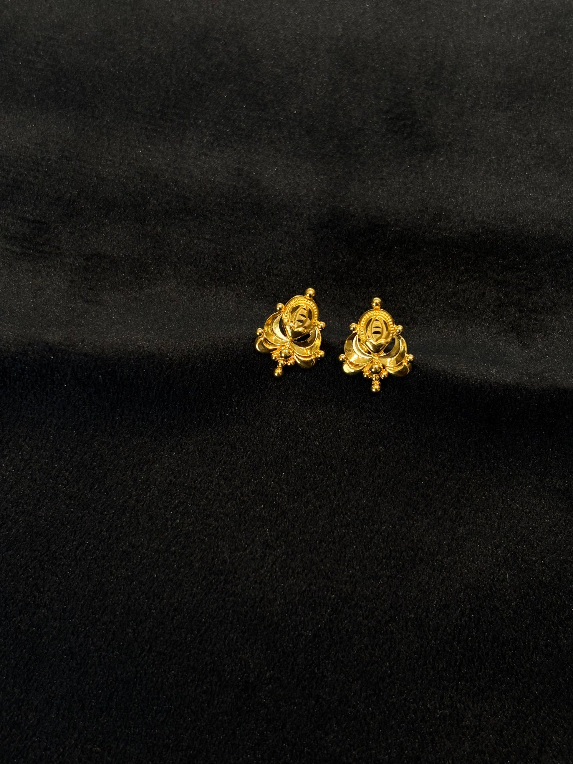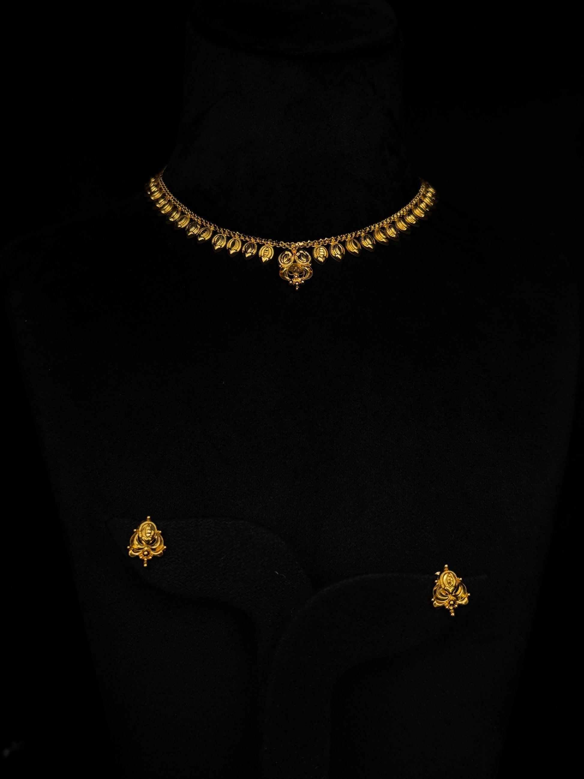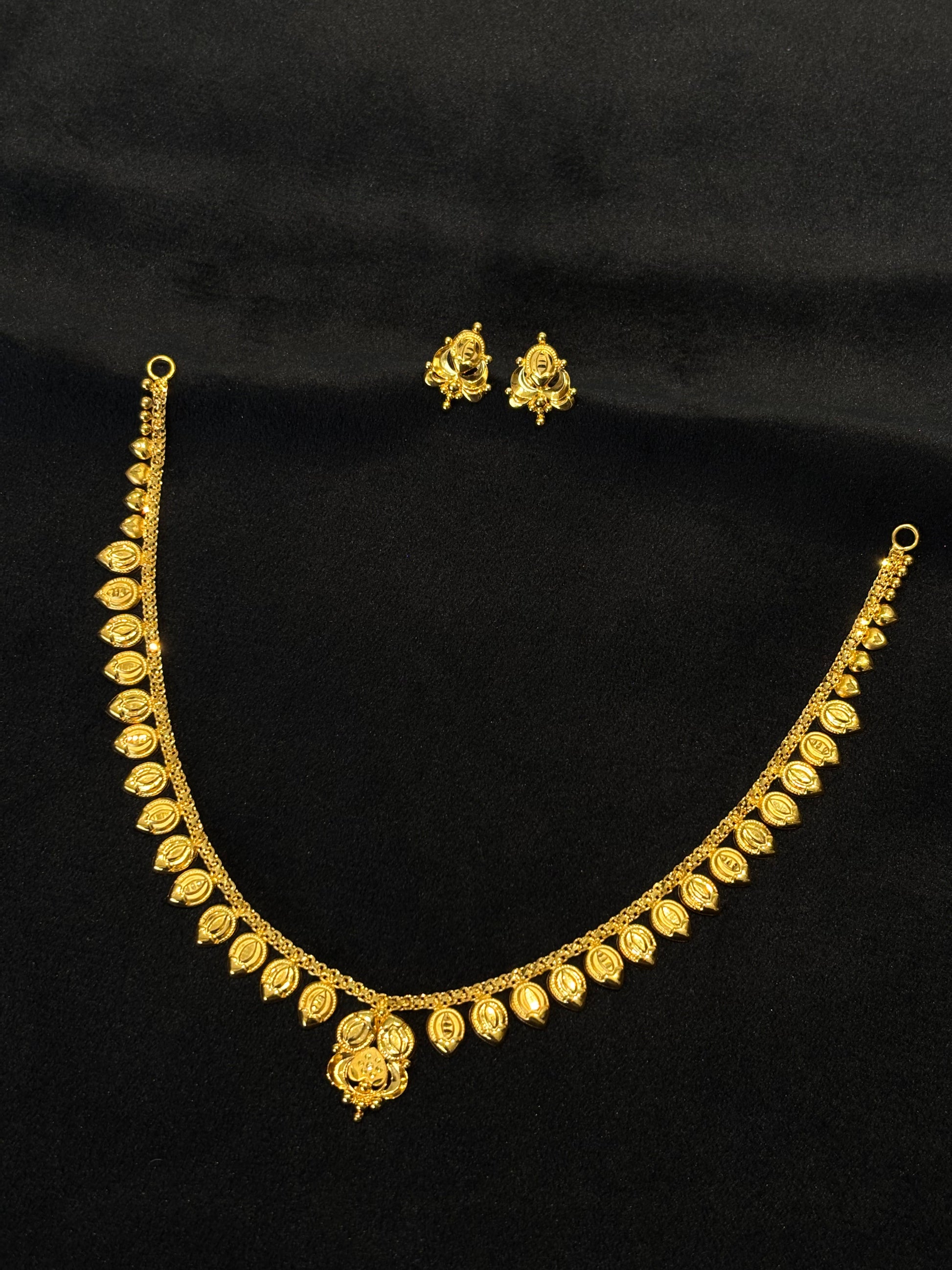 22K yellow gold necklace and matching stud earrings. The necklace features a captivating design of finely detailed leaf or berry-shaped motifs that gracefully line the neckline, culminating in a subtle centerpiece. The coordinating stud earrings echo a similar intricate pattern, offering a blend of natural elegance and traditional craftsmanship, perfect for everyday wear or special occasions.