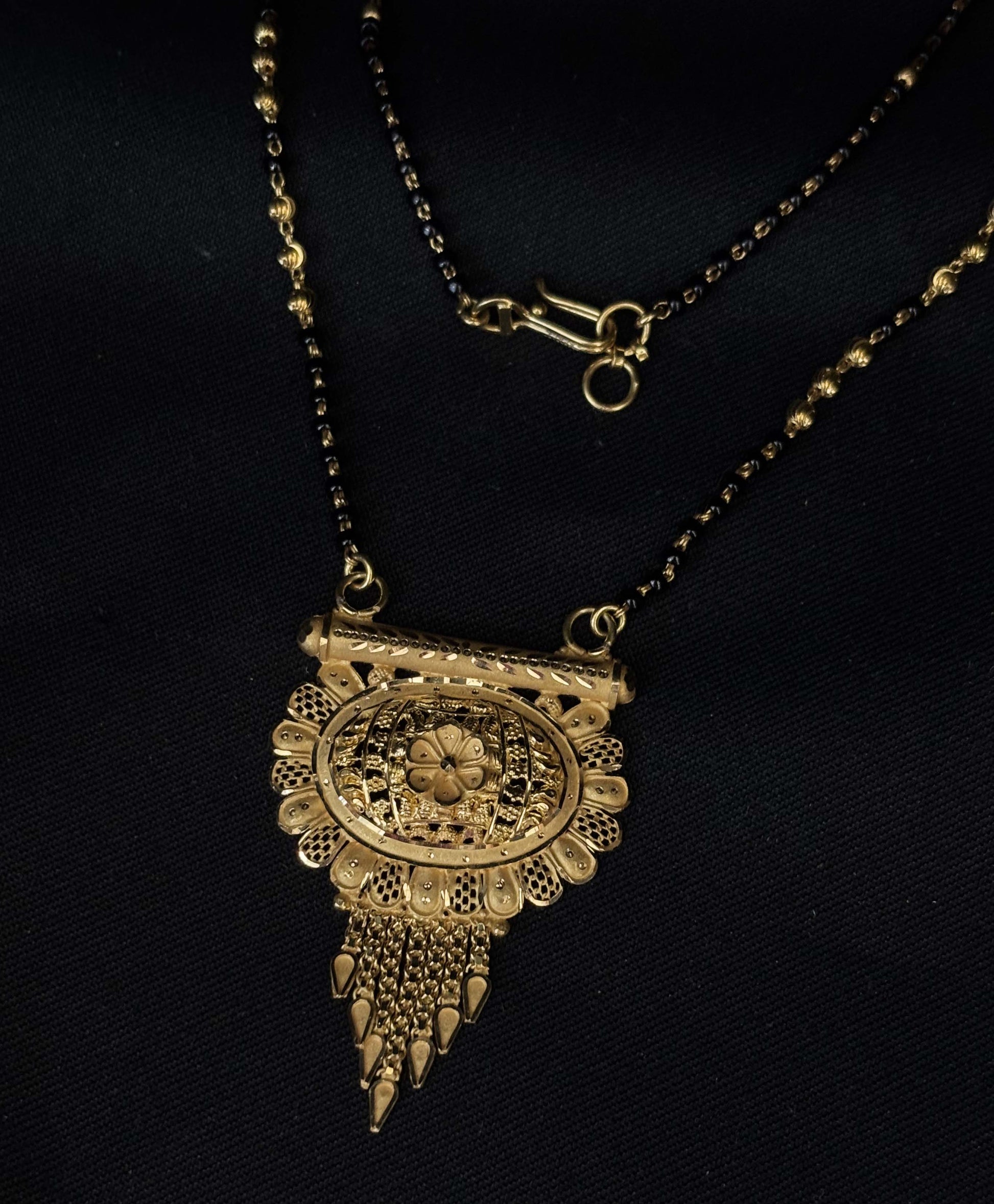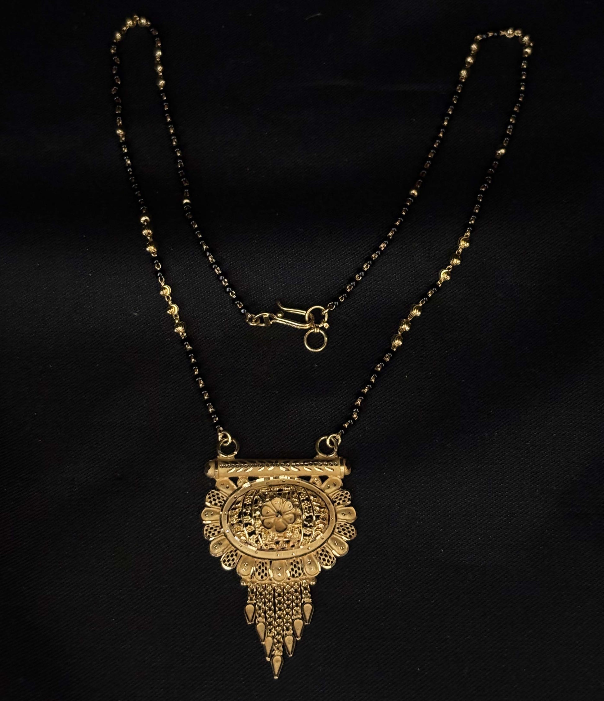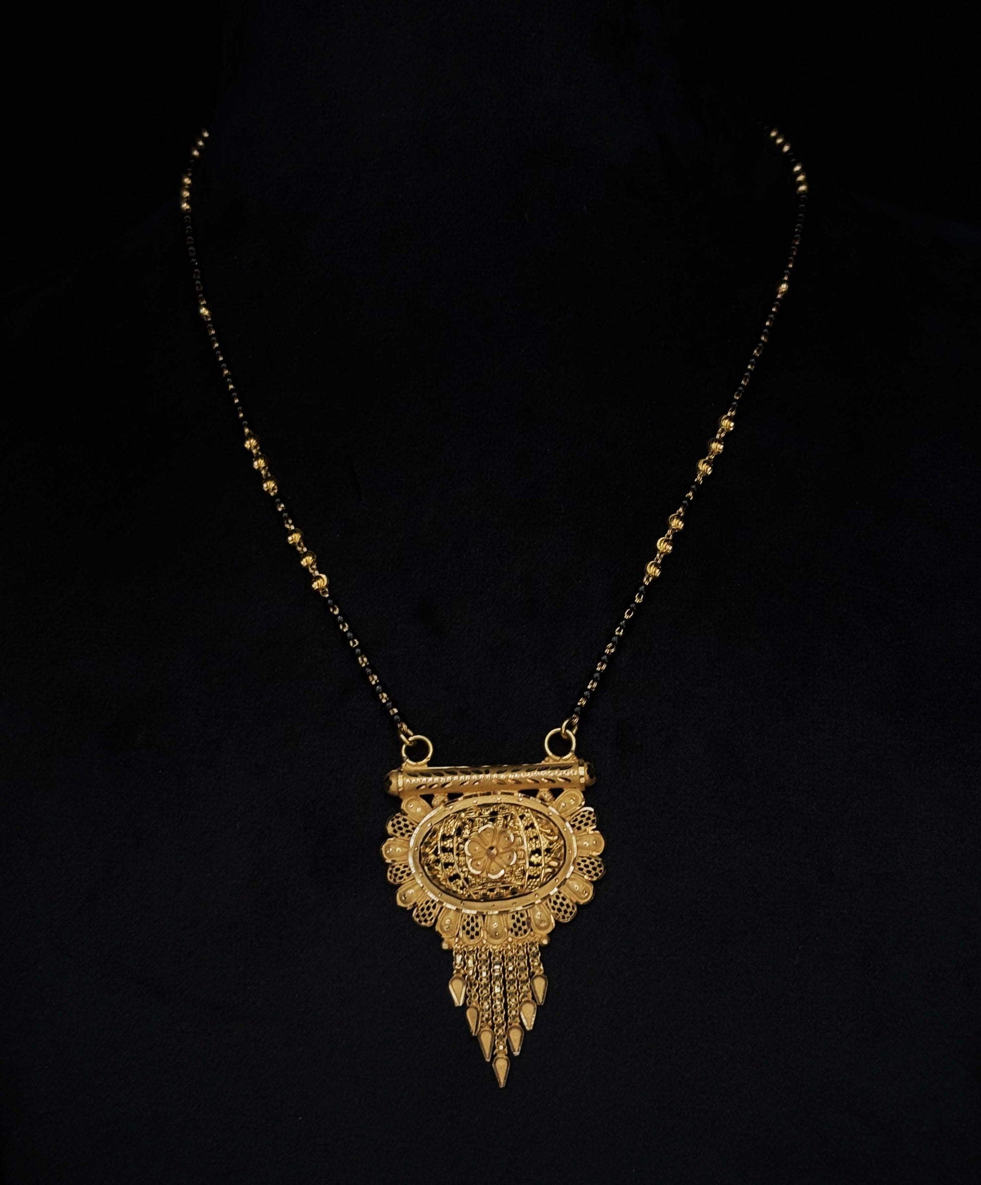 22K yellow gold Mangalsutra. Featuring a beautifully detailed pendant with intricate filigree work and delicate dangling elements, this necklace exudes traditional charm. The classic black beads are elegantly interspersed with gold accents, creating a meaningful and stylish piece perfect for celebrating your special bond.