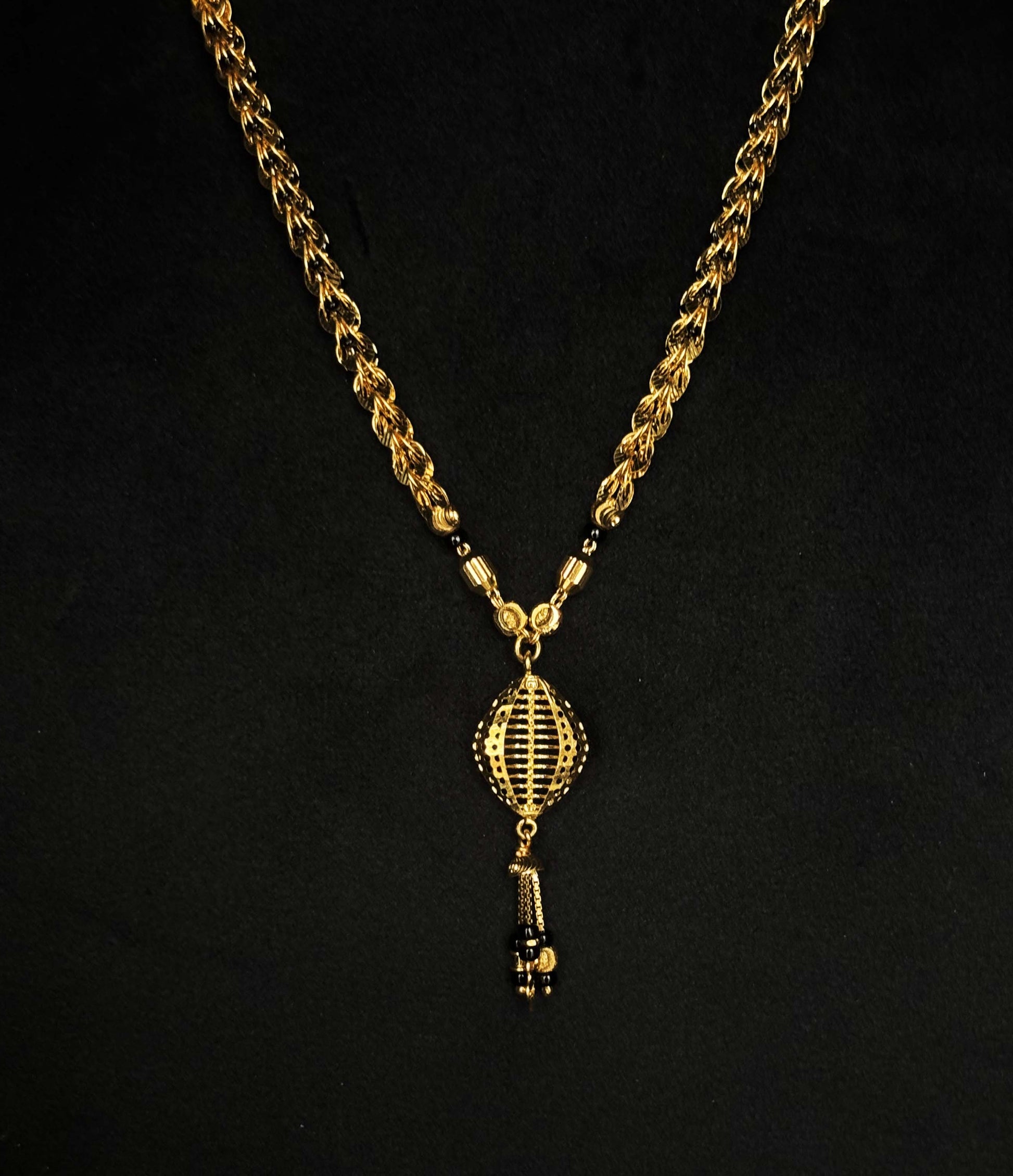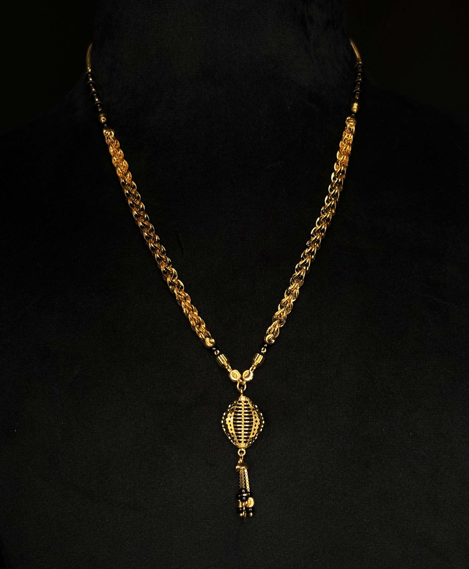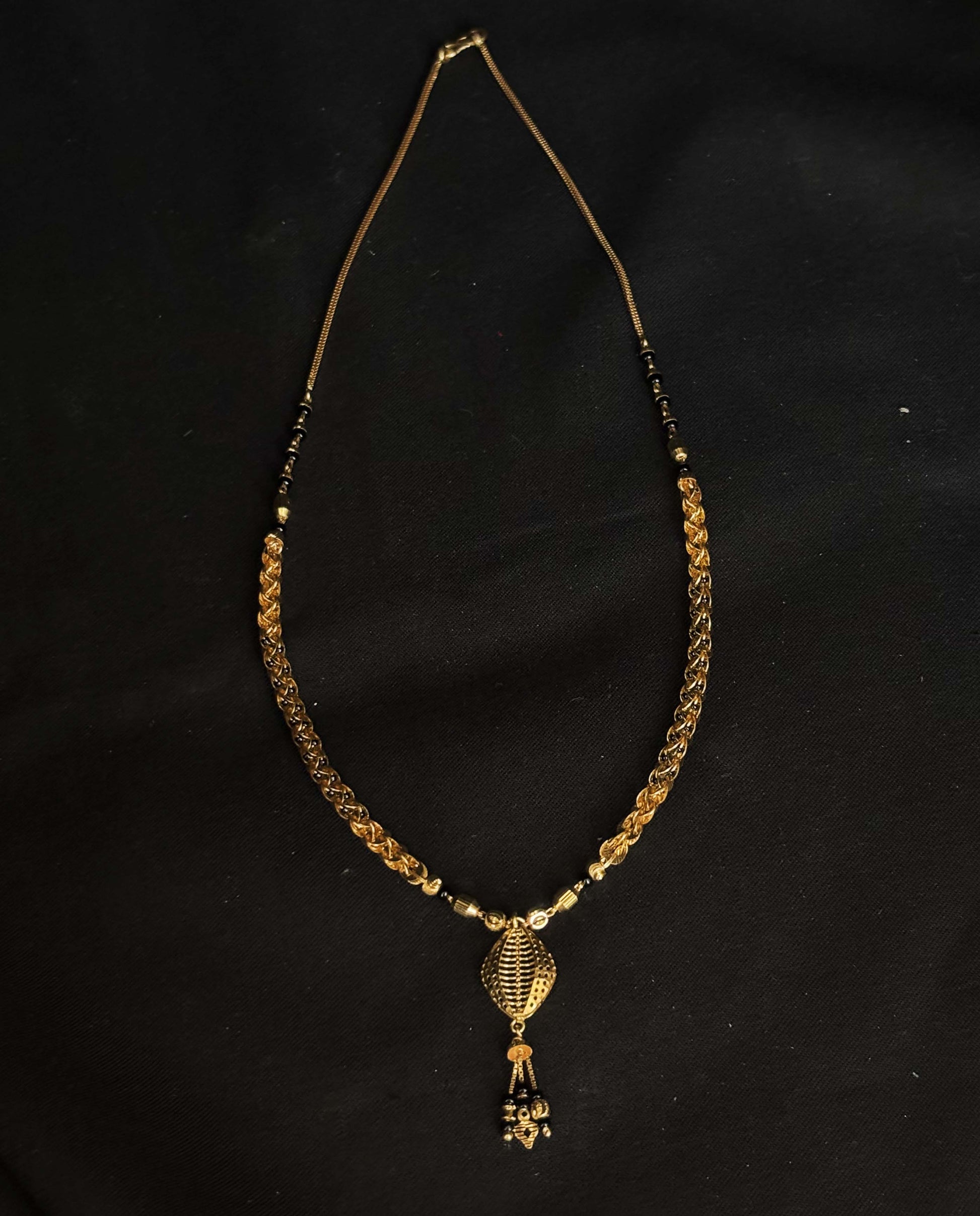 22K yellow gold Mangalsutra necklace. Featuring a beautifully woven gold chain interspersed with classic black beads, the necklace highlights a unique geometric pendant with delicate detailing and dangling elements.