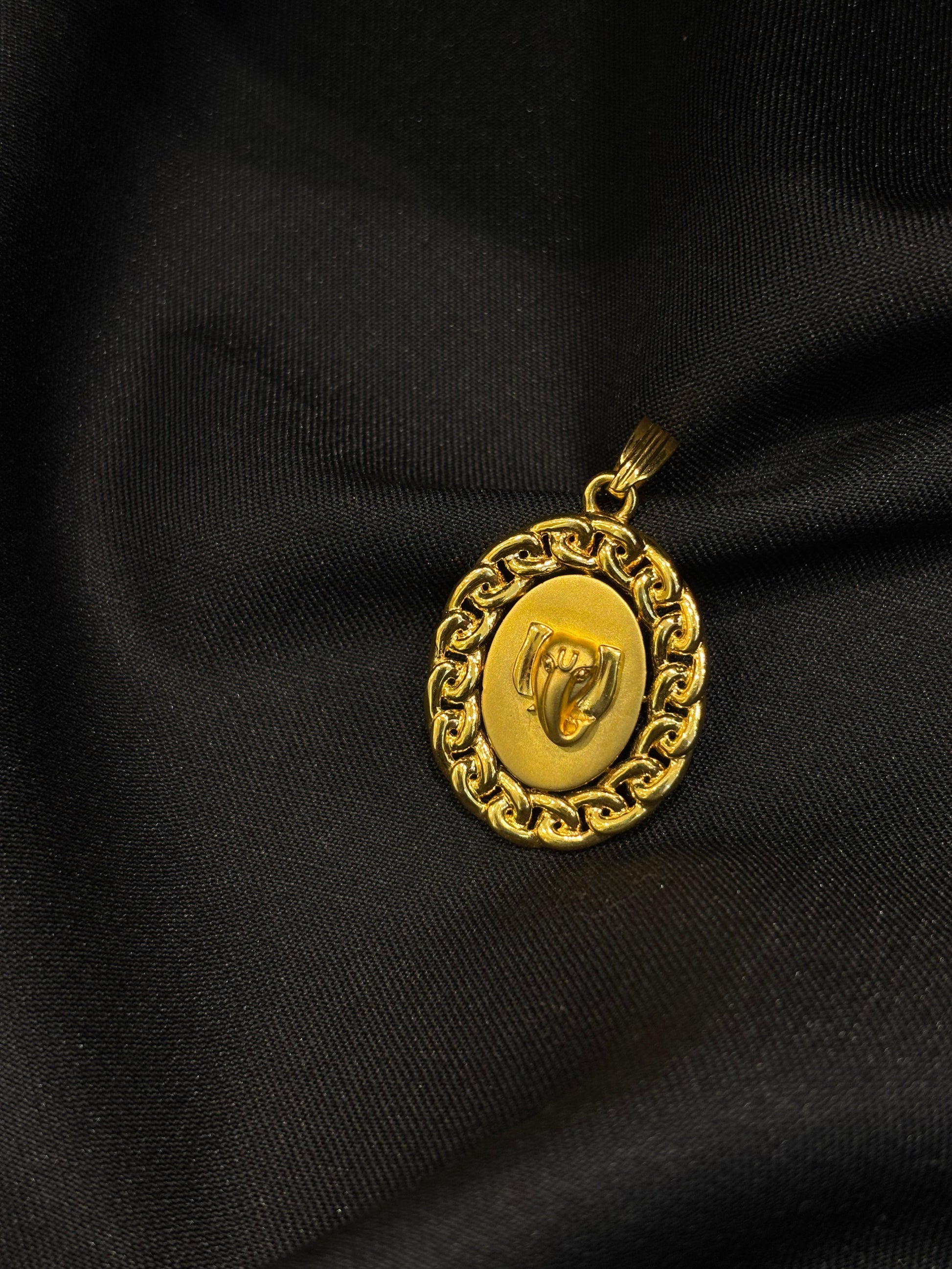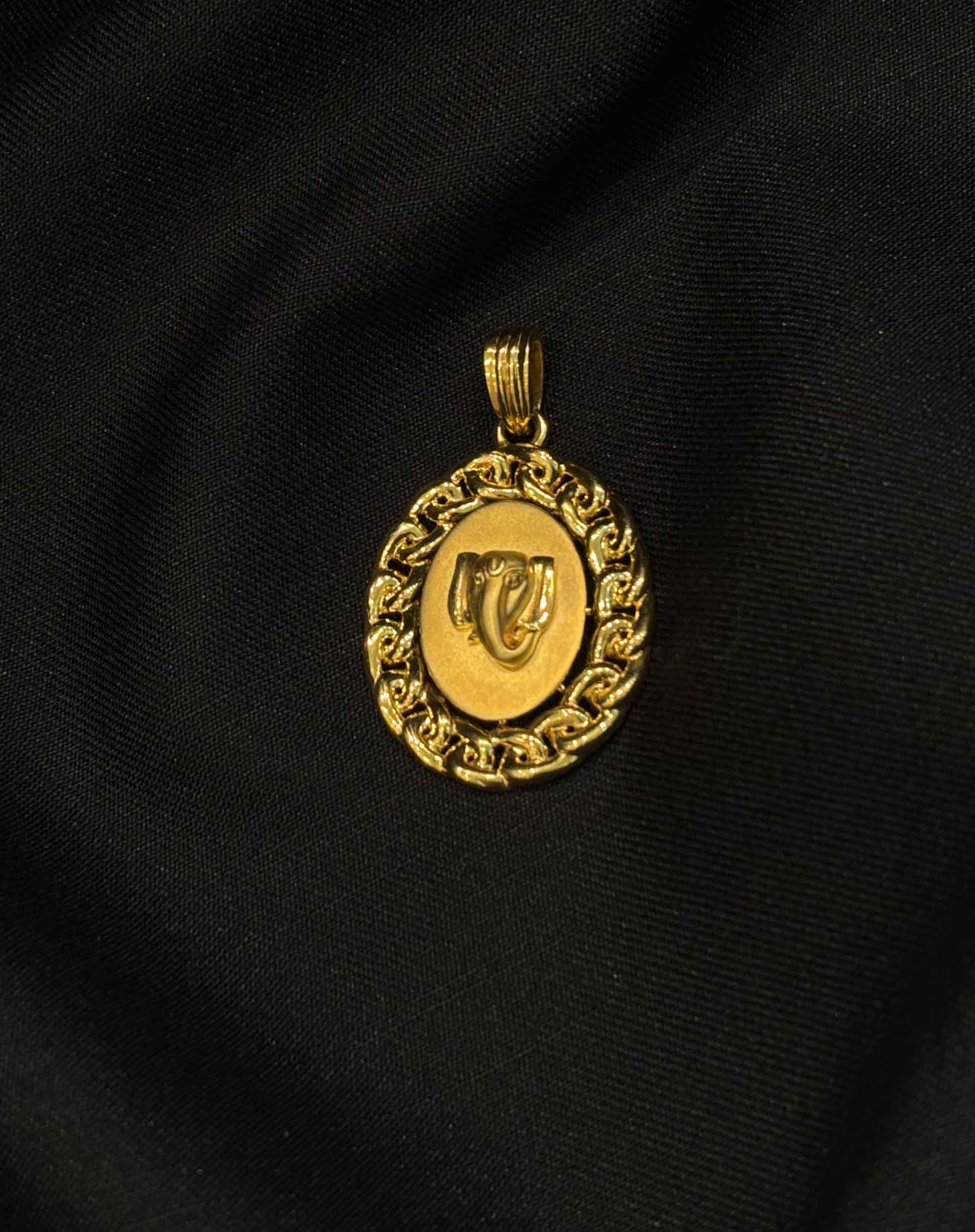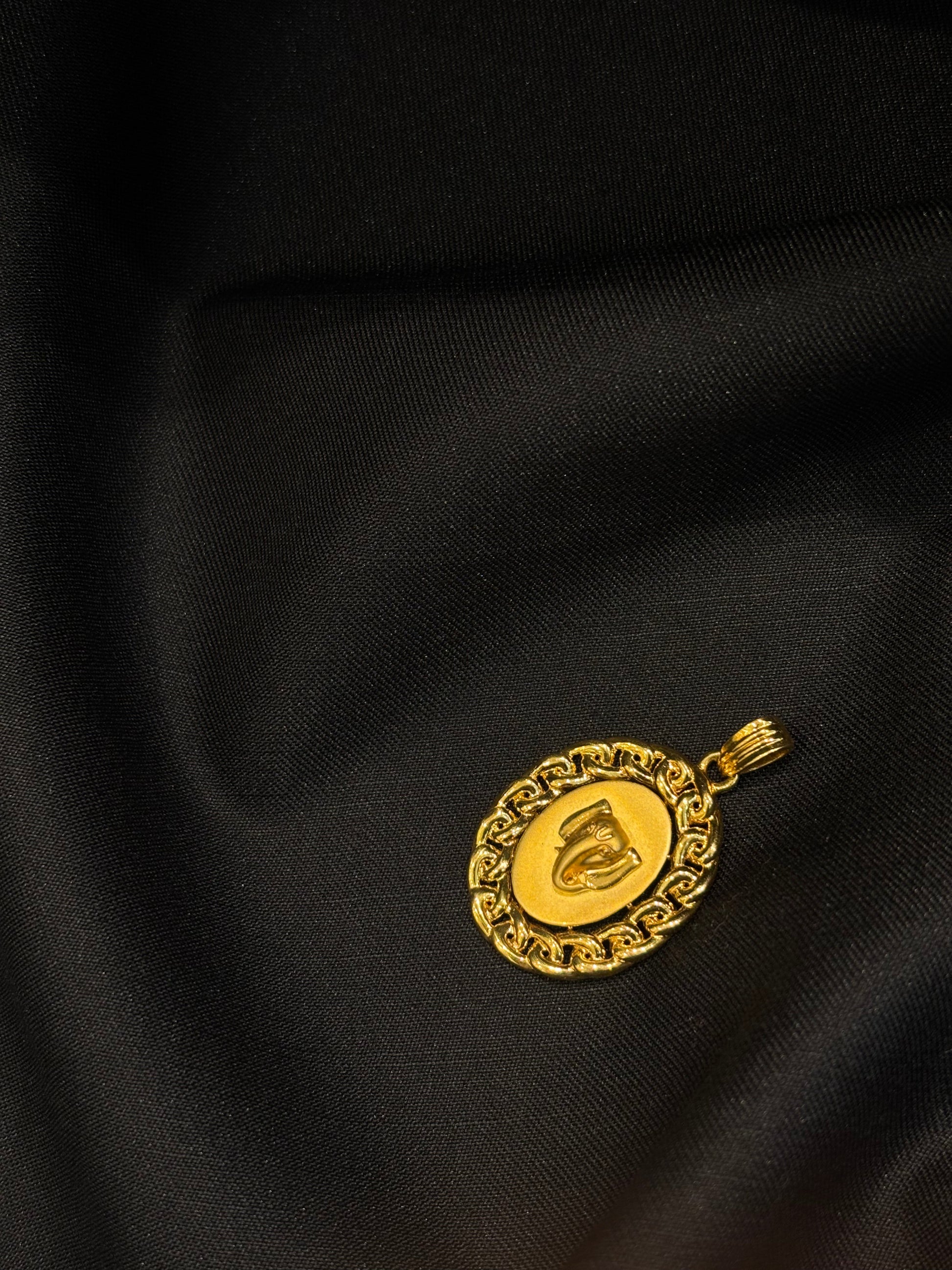 22K gold medallion pendant features a distinctive design with a textured chain border surrounding a central motif. The intricate details and radiant gold finish make this pendant a stylish and eye-catching accessory. Perfect for adding a touch of elegance to any outfit.