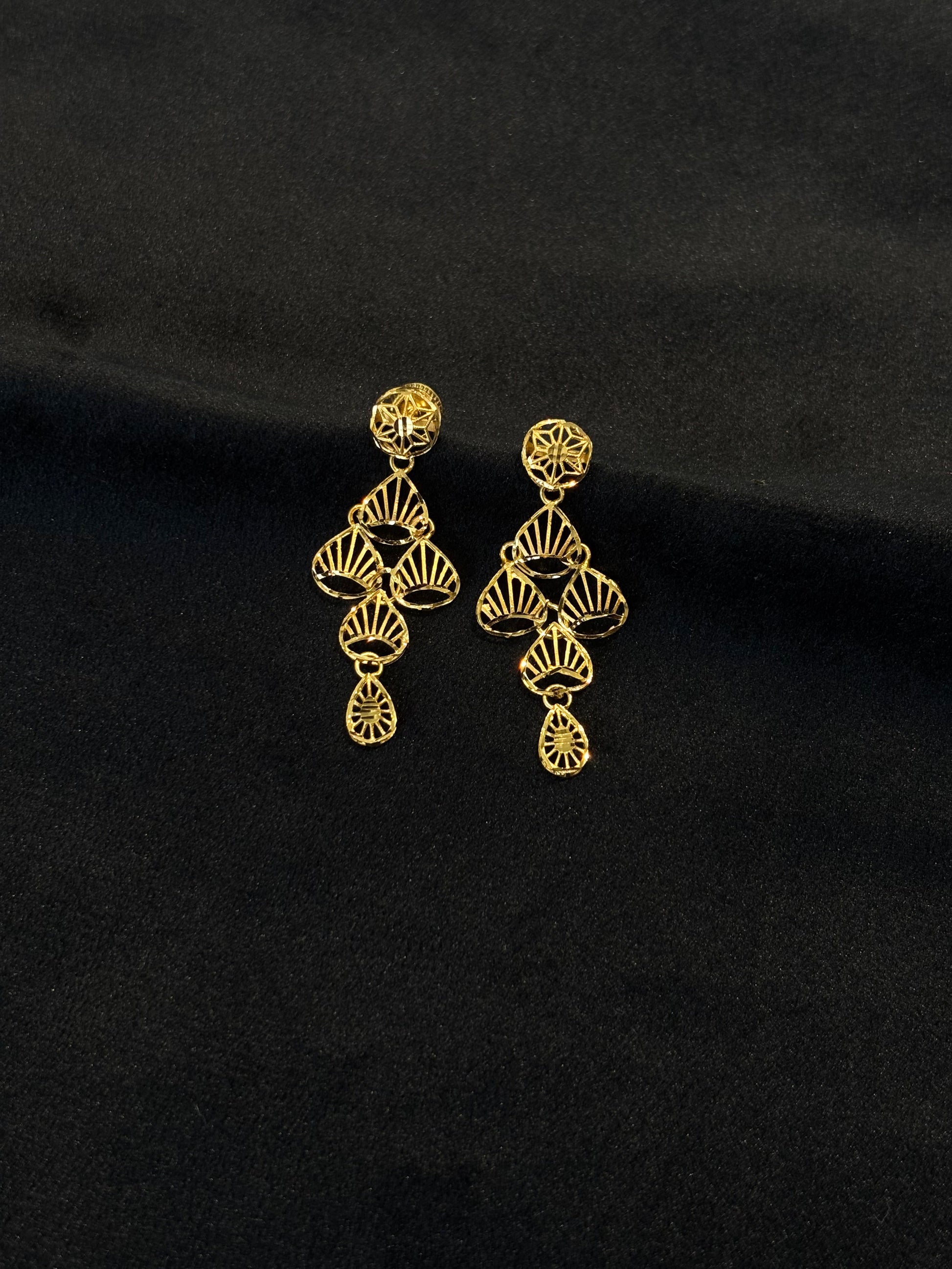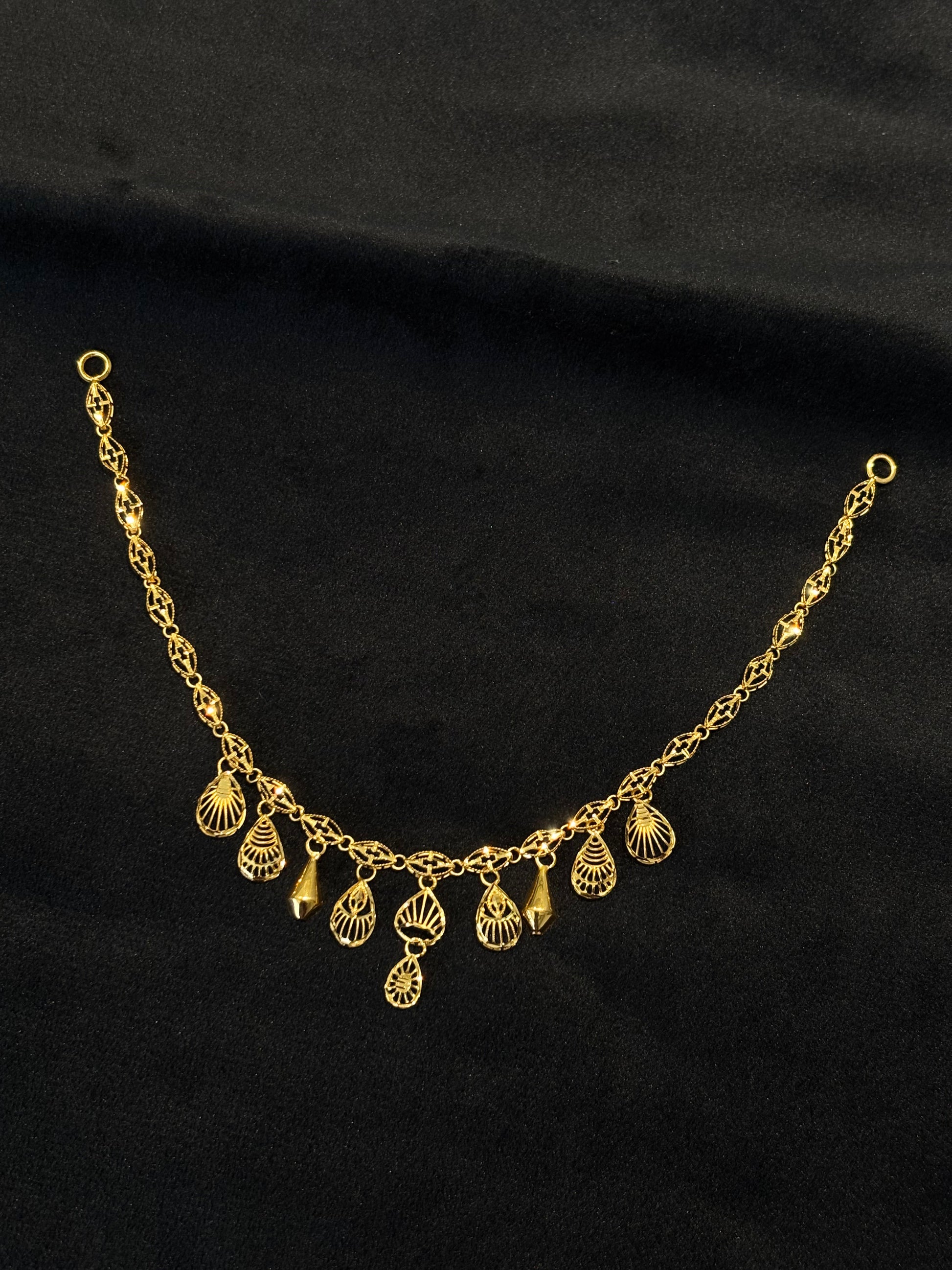 22K yellow gold necklace and matching earrings set. The necklace features a beautifully crafted design with a series of intricate gold elements that resemble delicate bells or charms, creating a captivating fringe effect.