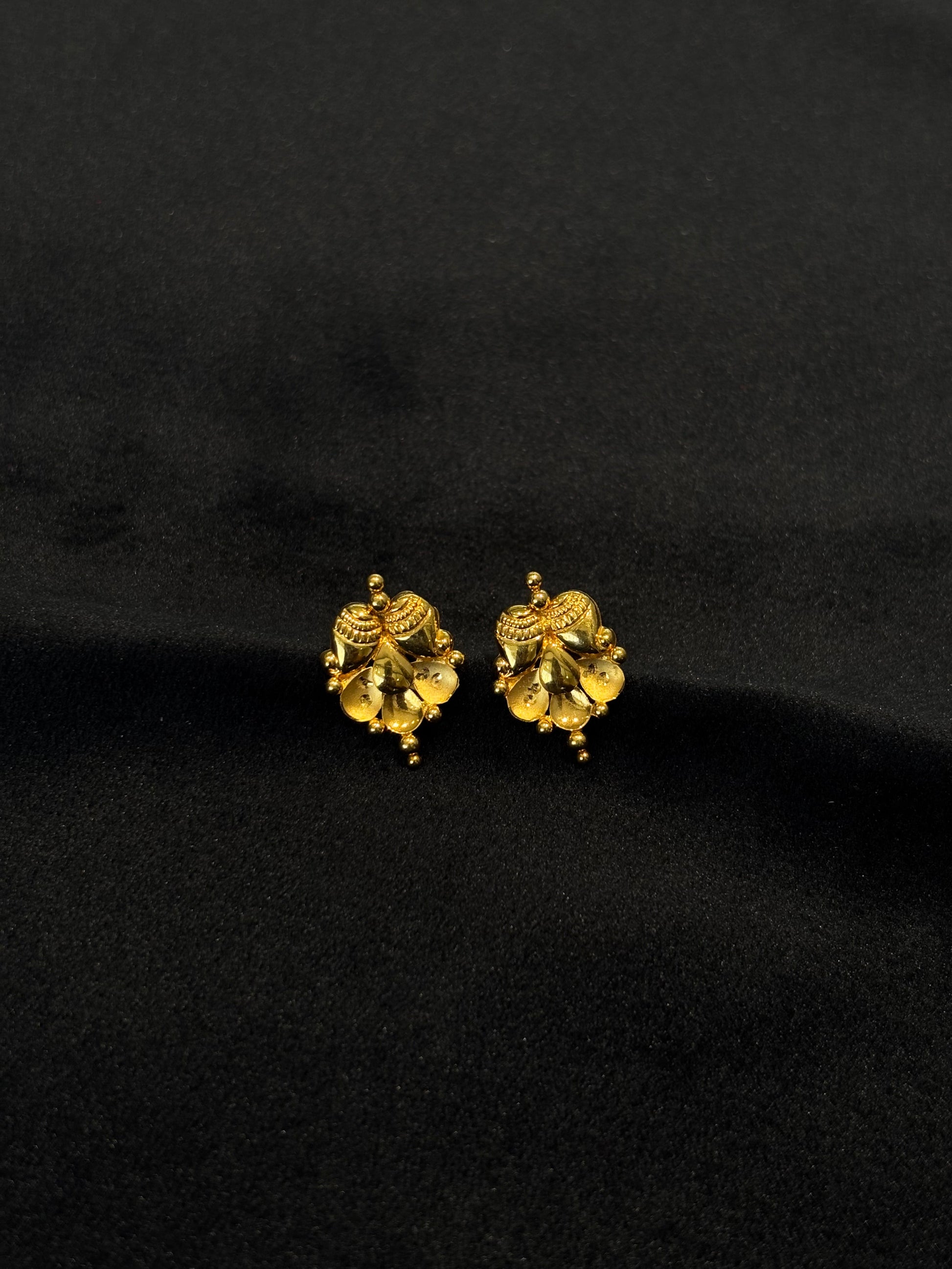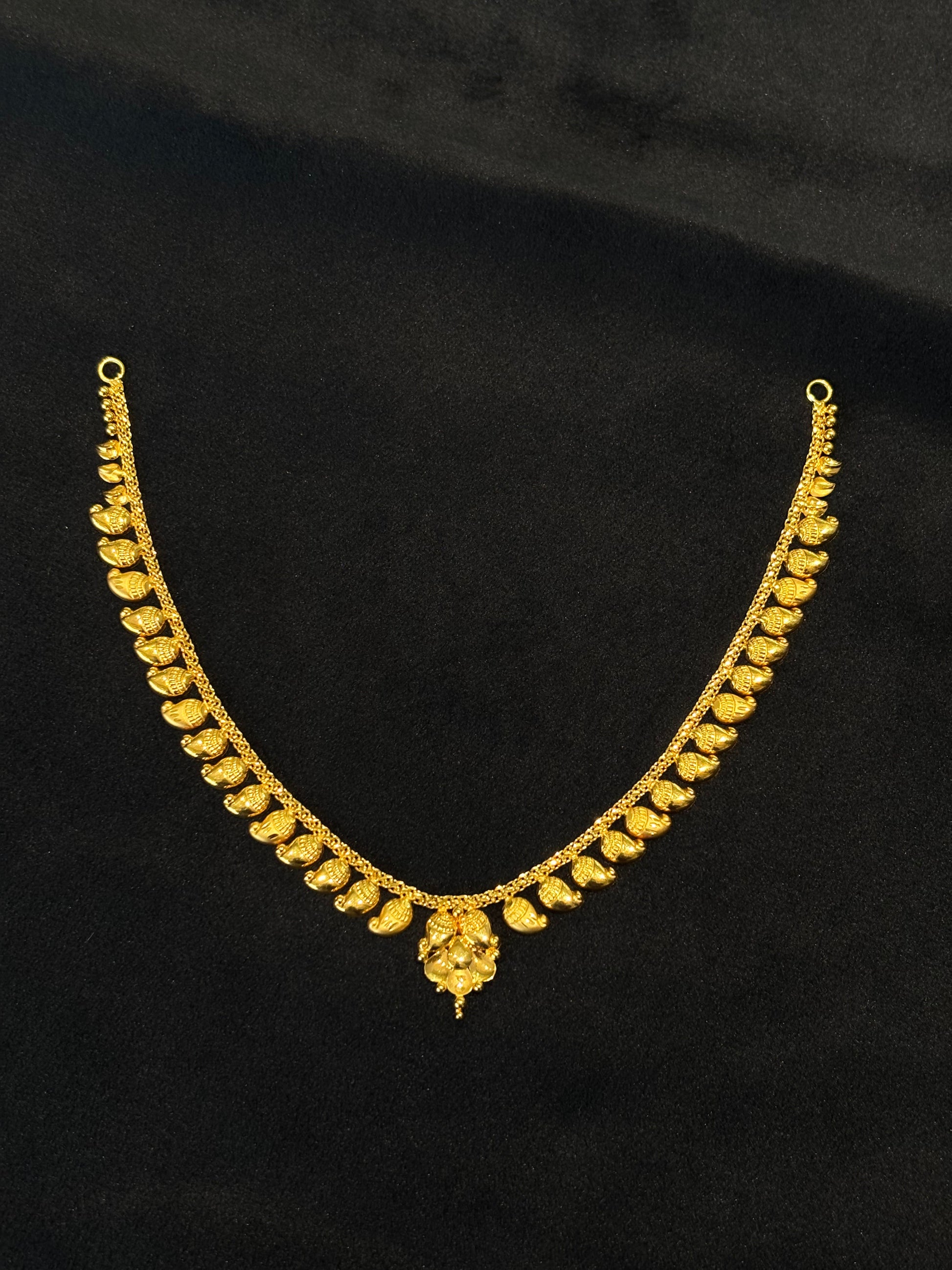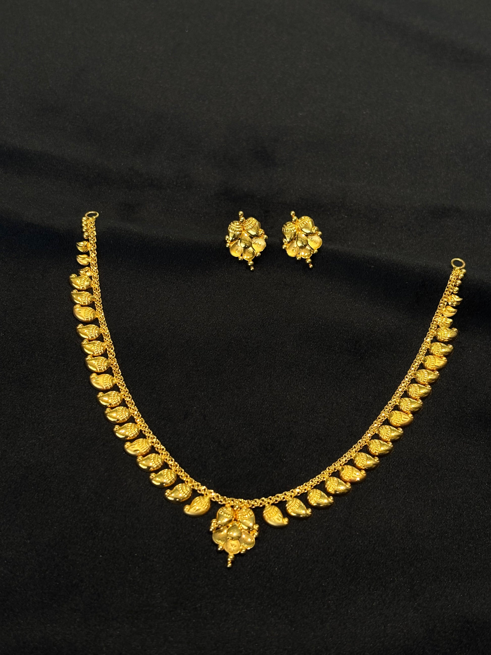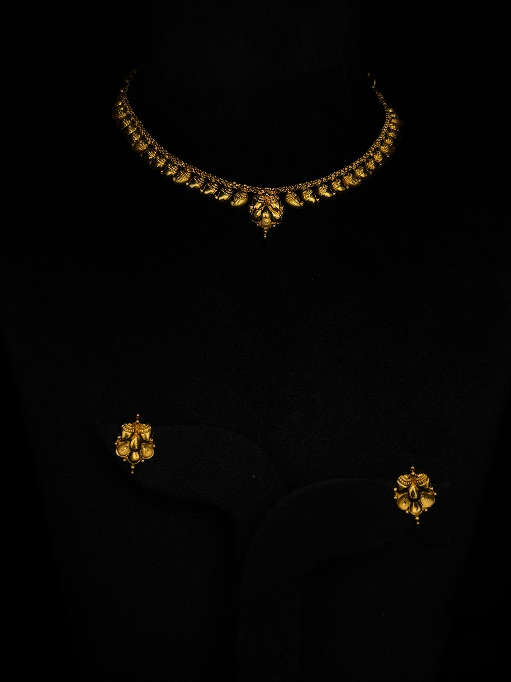 22K yellow gold necklace and matching stud earrings. The necklace features a continuous design of beautifully crafted gold leaf motifs, culminating in a charming floral centerpiece.