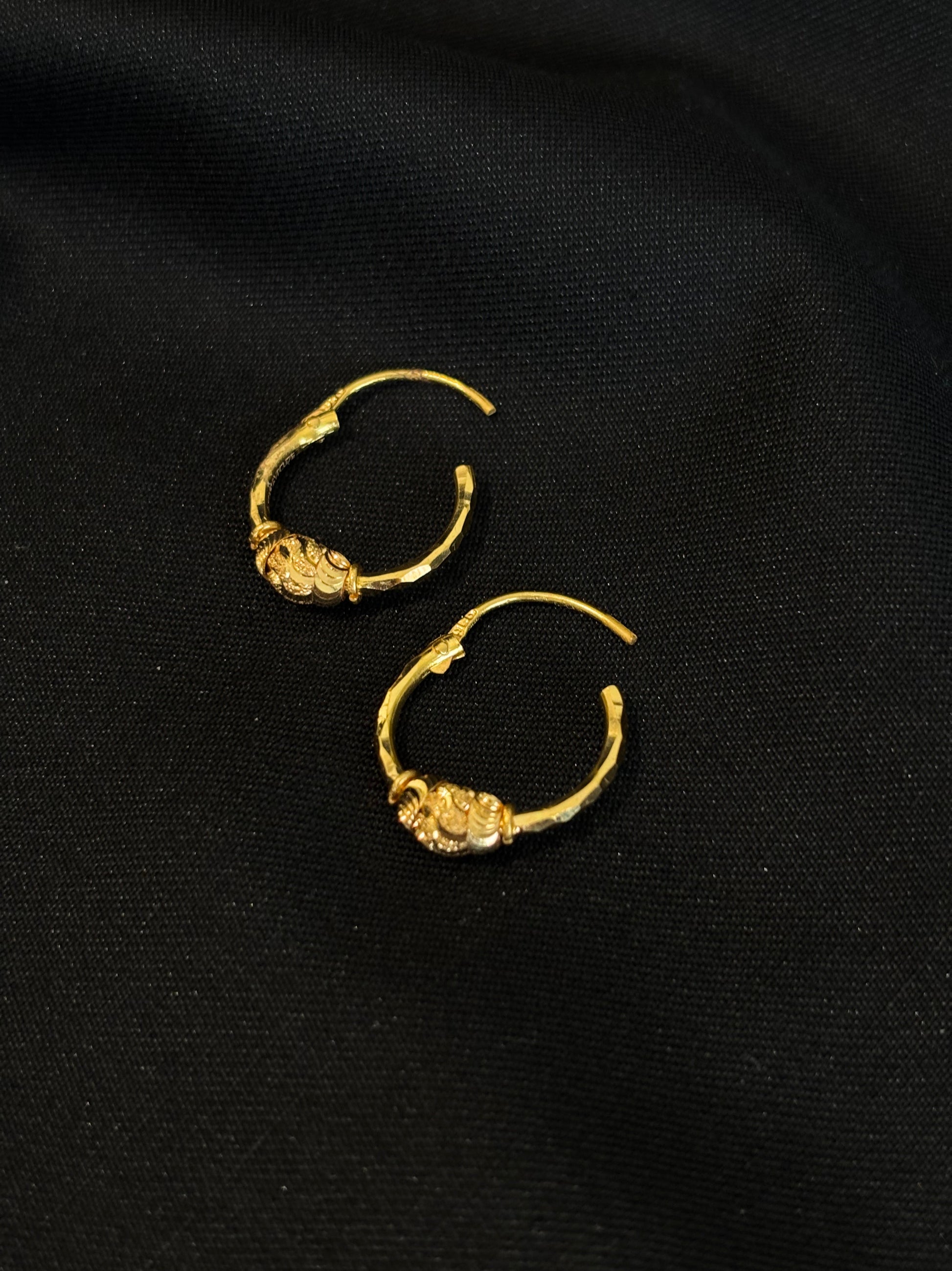 22K yellow gold bali (hoop) earrings. Featuring a clean, simple circular design with a subtle hammered or textured finish, these versatile hoops add a touch of golden radiance perfect for any occasion.