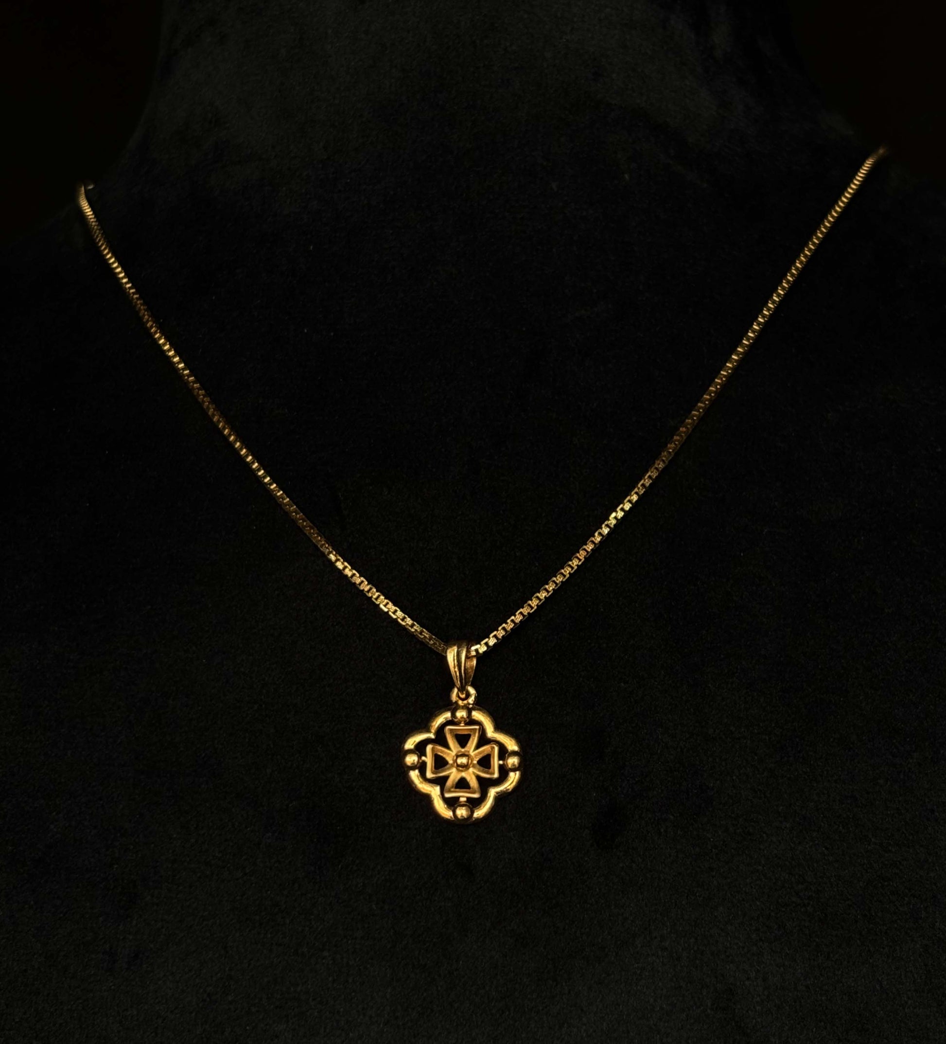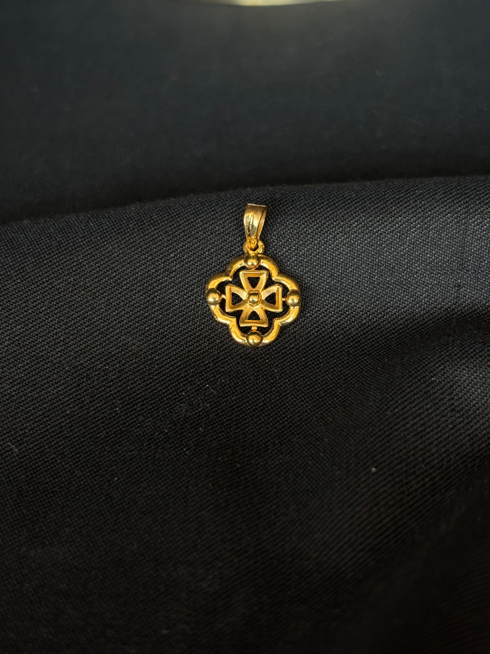22K yellow gold pendant featuring a stylized quatrefoil cross design. The quatrefoil, with its four symmetrical lobes, is an ancient symbol often associated with good fortune, balance, and interconnectedness. This pendant elegantly combines this meaningful shape with the timeless beauty of high-purity gold.
