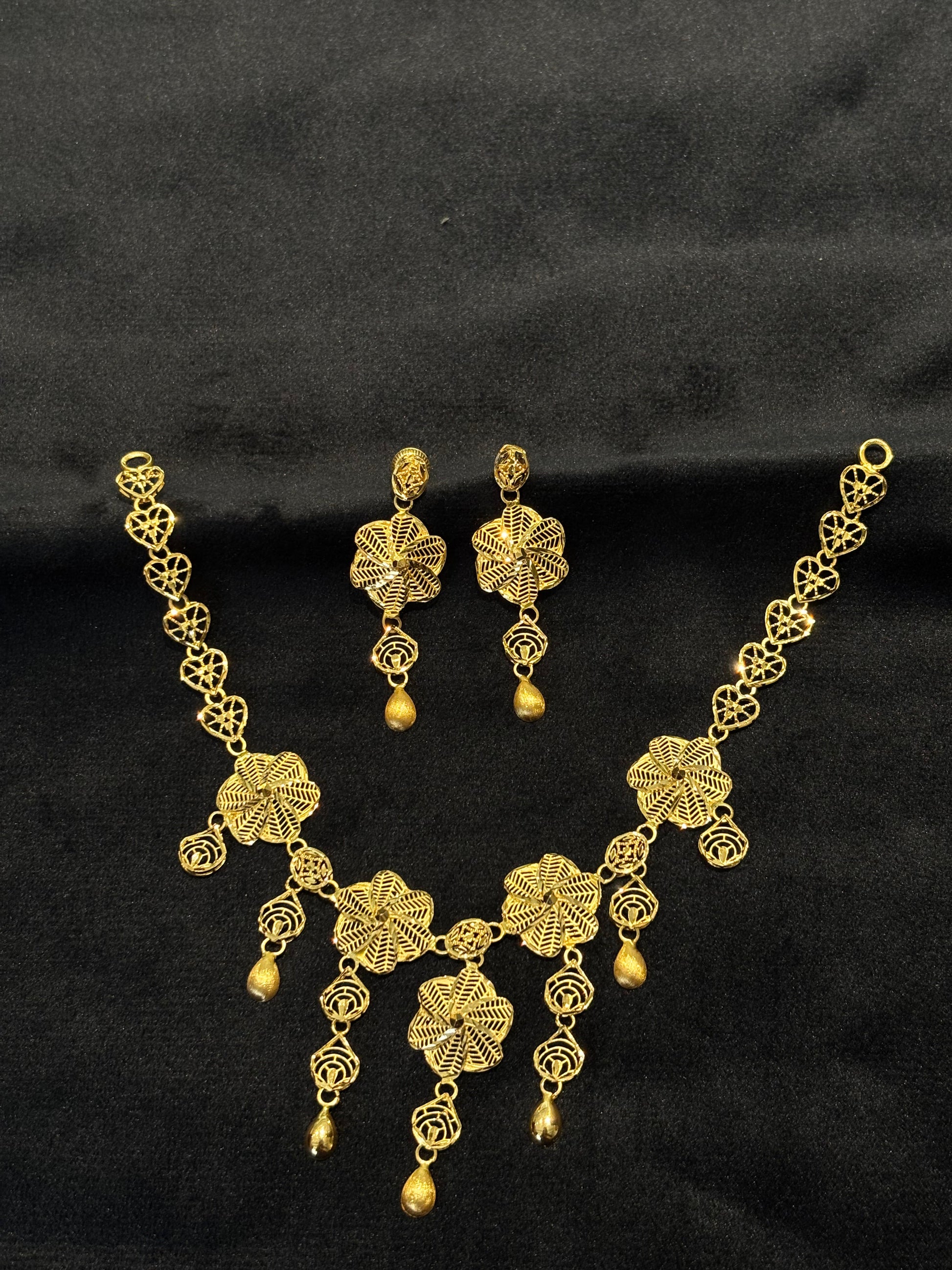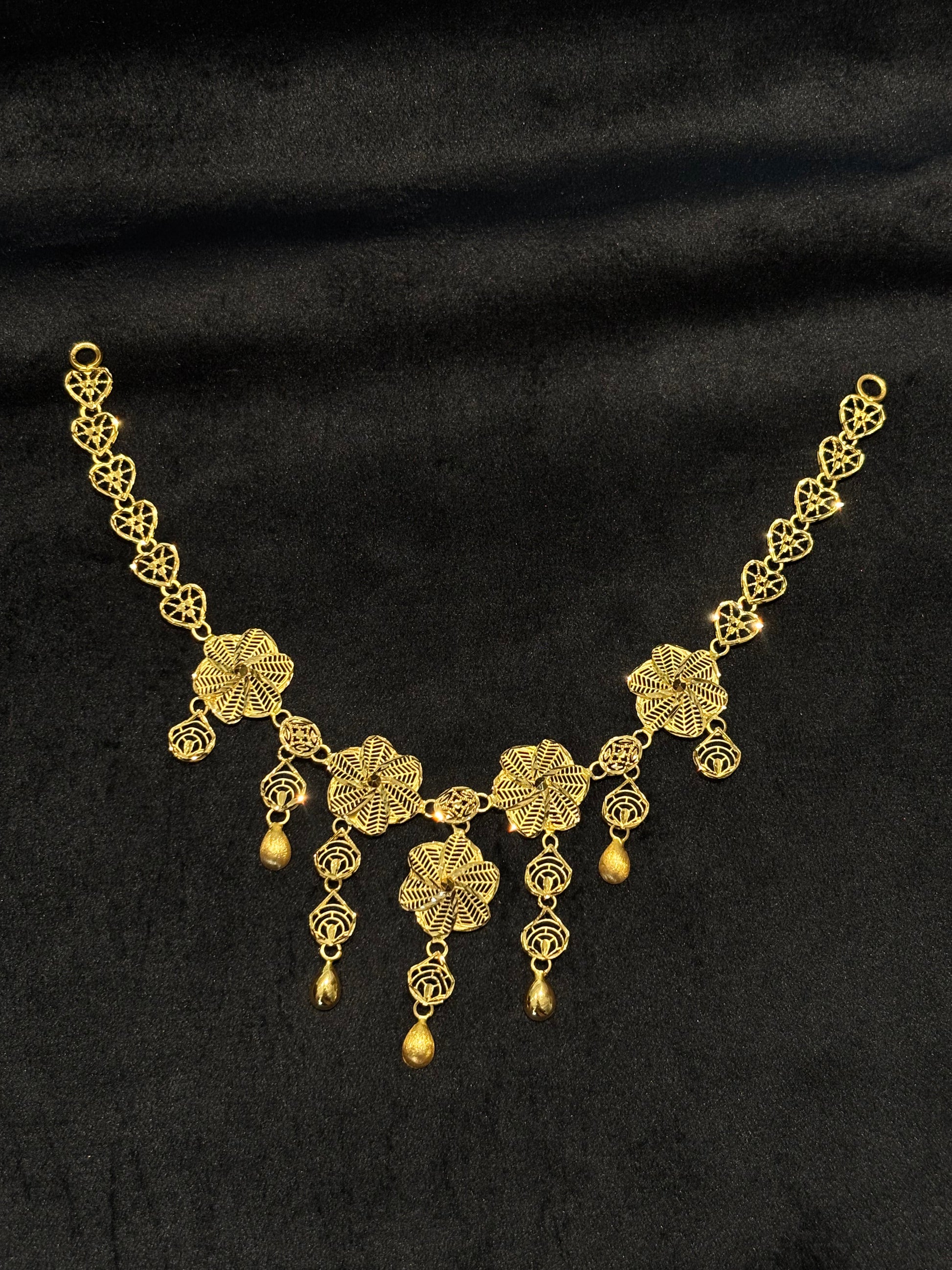22K yellow gold necklace and matching earrings set. The necklace features a captivating design composed of finely detailed filigree motifs and delicate gold balls, forming a rich and traditional pattern.