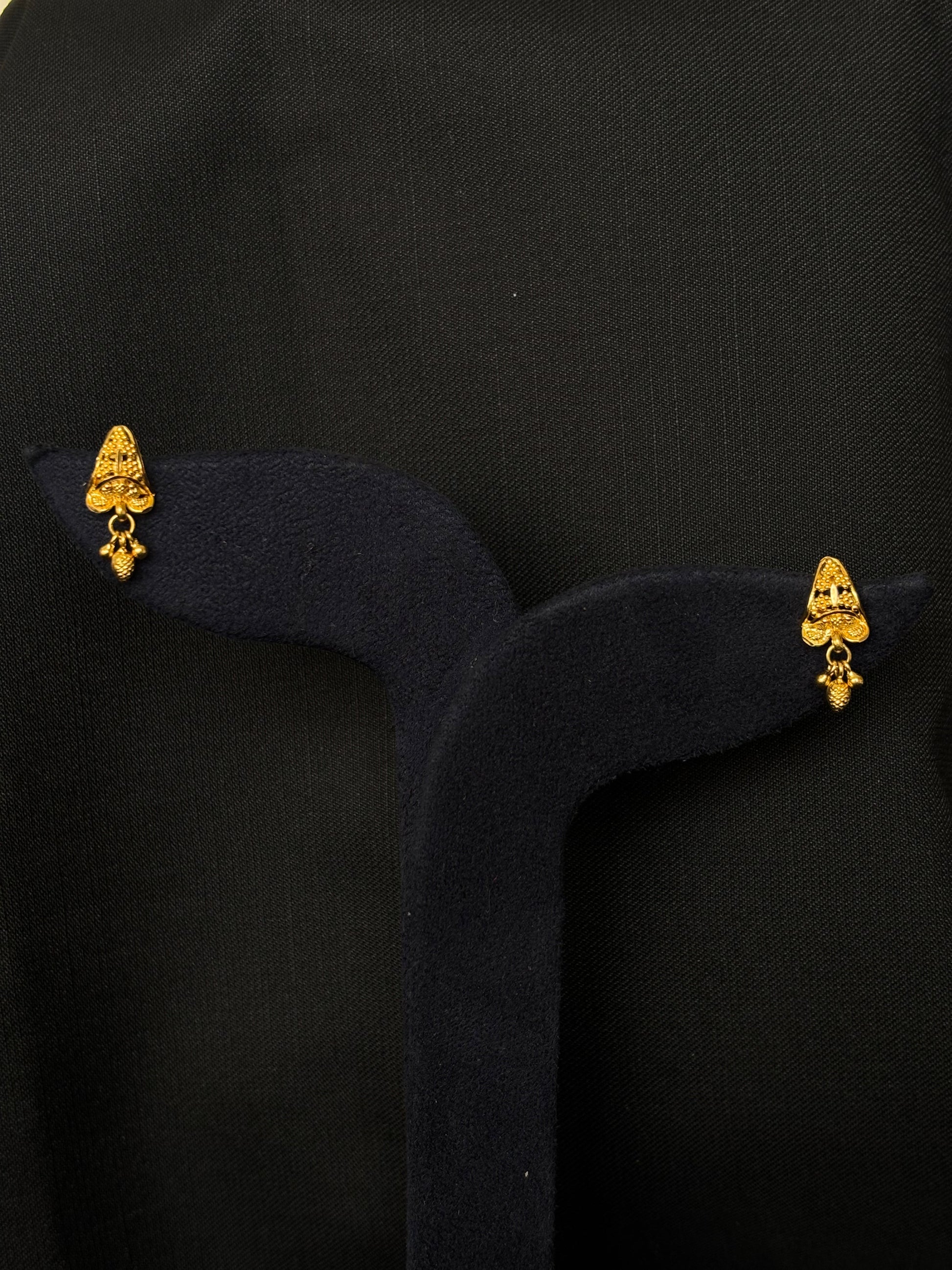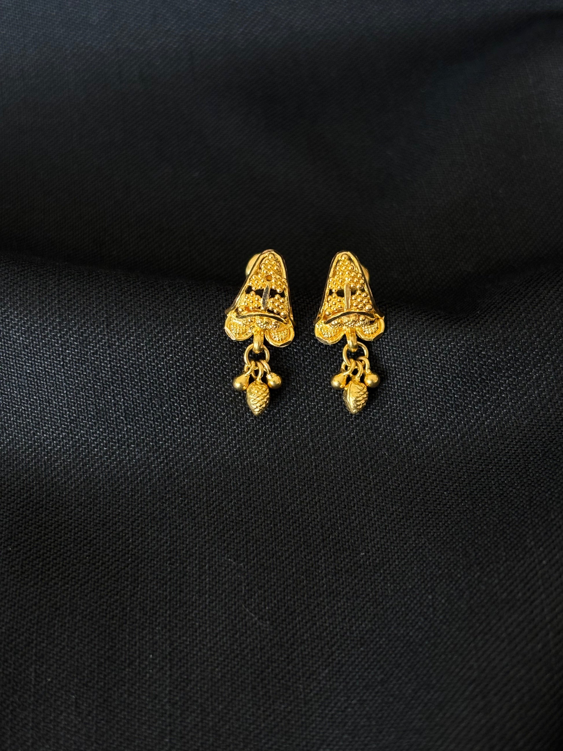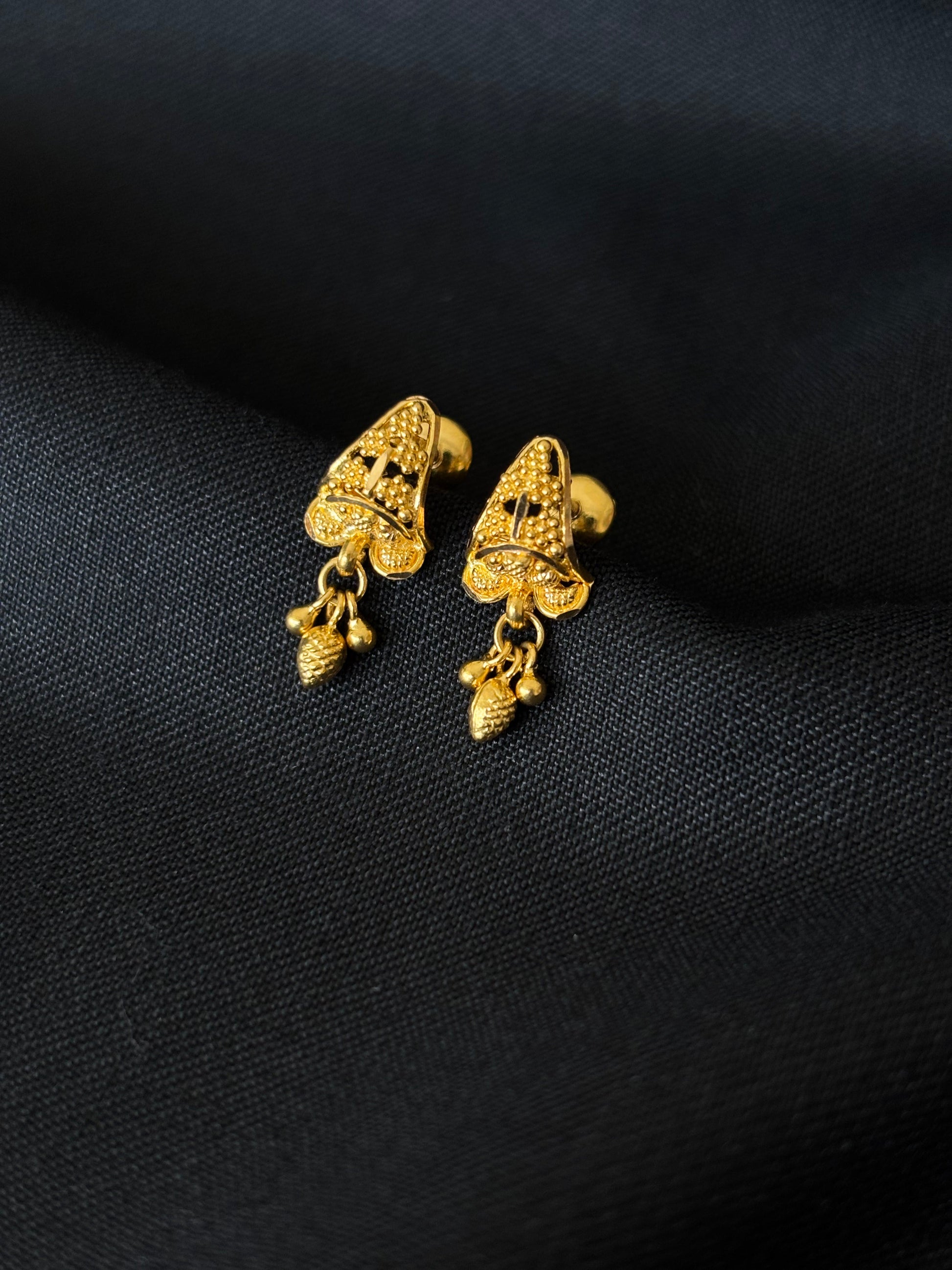 22K yellow gold stud earrings. Each earring features an intricate floral or traditional disc design, highlighted by a vibrant central ruby gemstone. These timeless studs offer a touch of classic charm and radiant gold, perfect for everyday wear or special occasions.