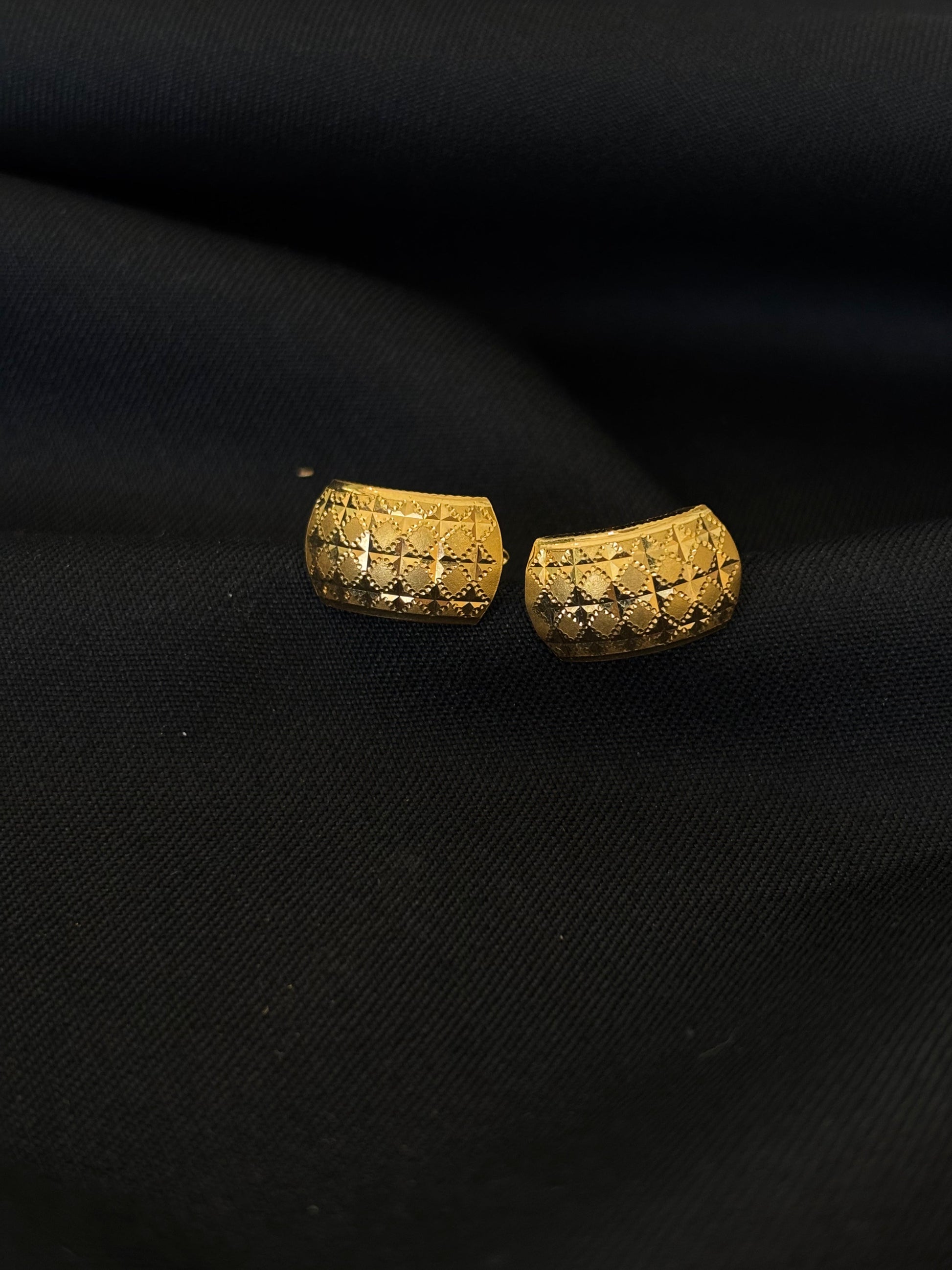 22K yellow gold stud earrings. Featuring a unique, curved shape with a striking textured and geometric pattern, these modern studs offer a refined and radiant touch of gold, perfect for any occasion.