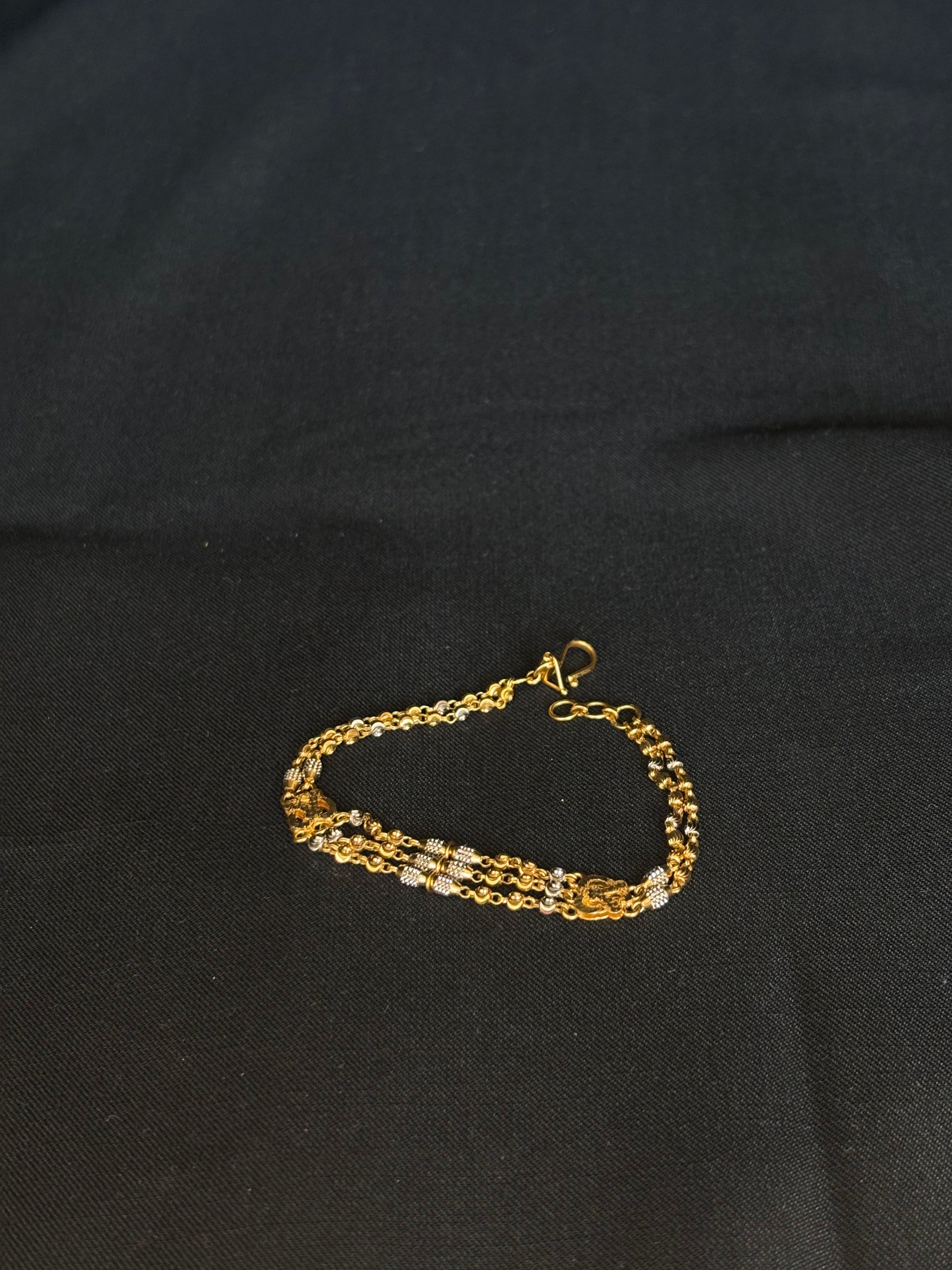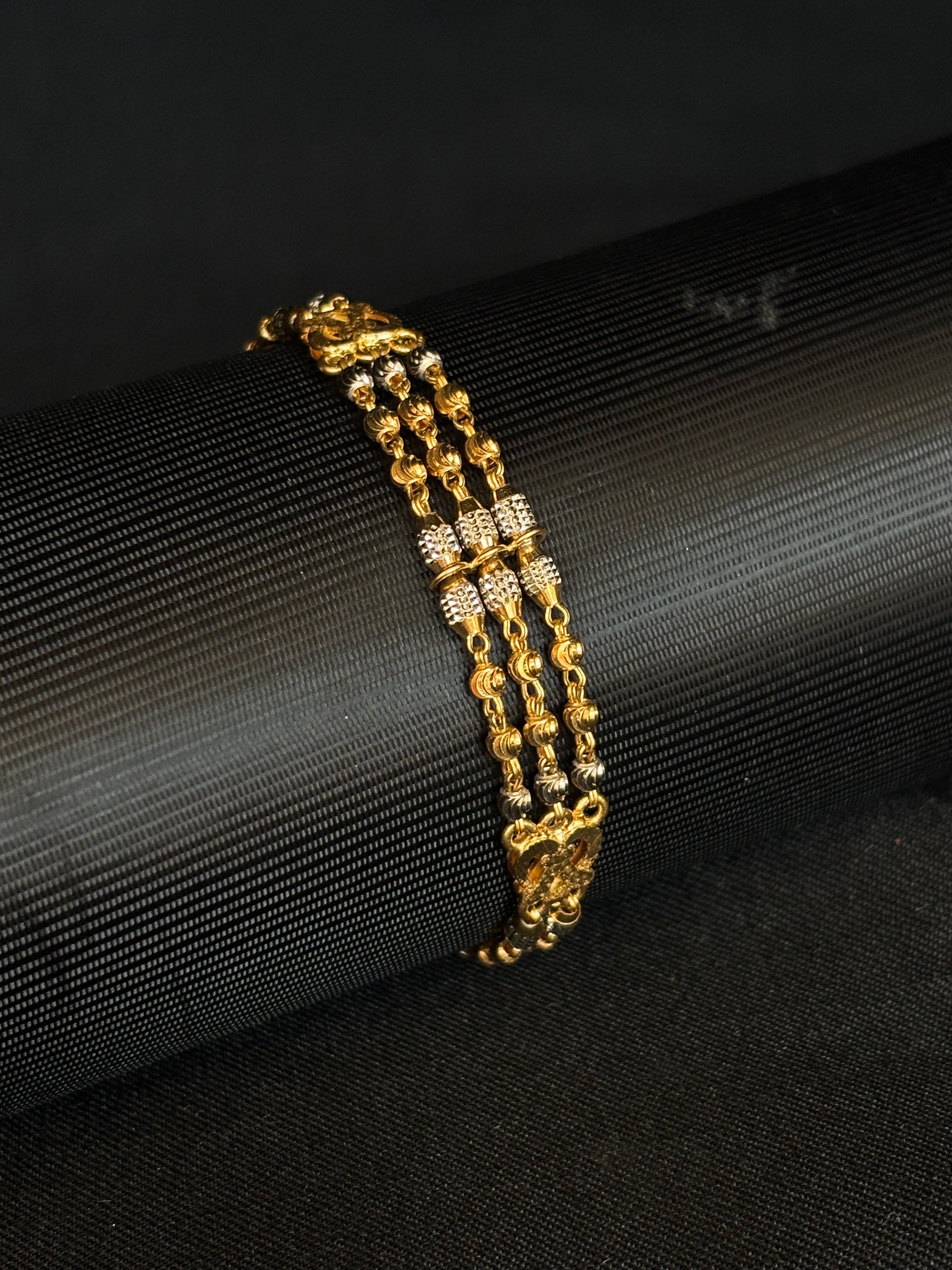 22K yellow gold bracelet from Premsay Jewellers. Featuring a stylish three-layer design with intricate goldwork, this bracelet offers a unique and elegant look.