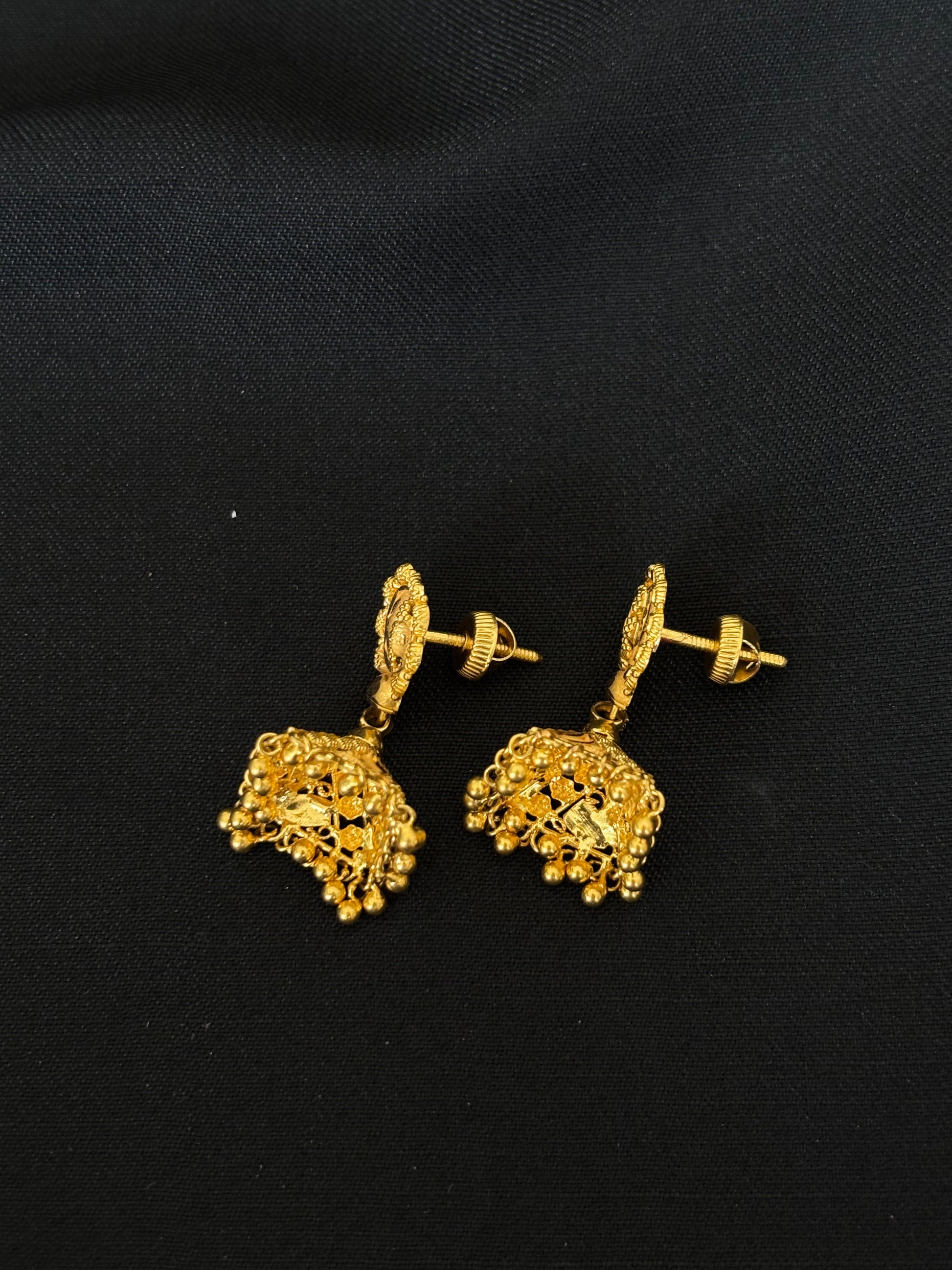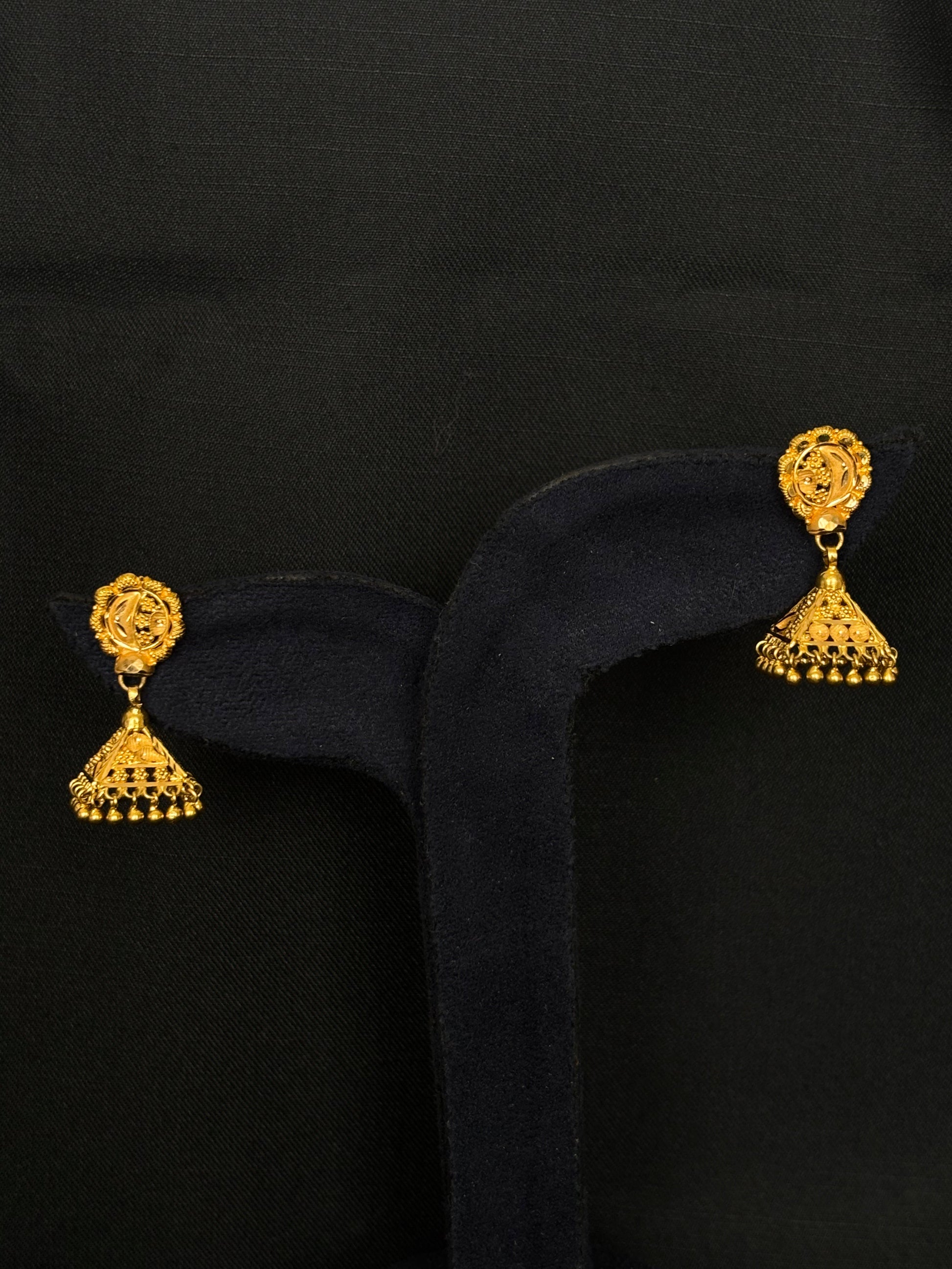 22K yellow gold jhumka earrings. Each earring features an intricately designed stud top connected to a classic bell-shaped drop adorned with delicate golden beads.