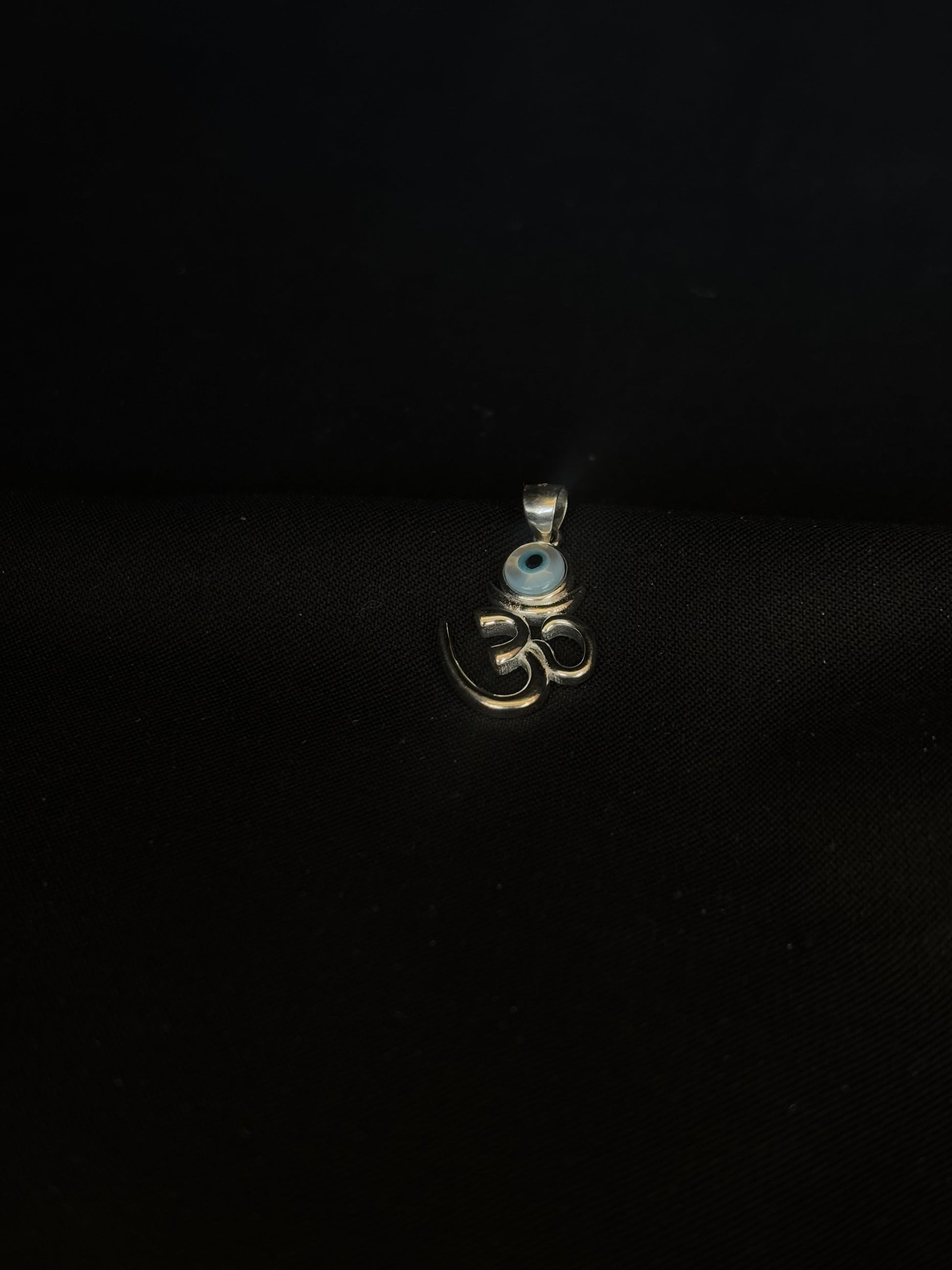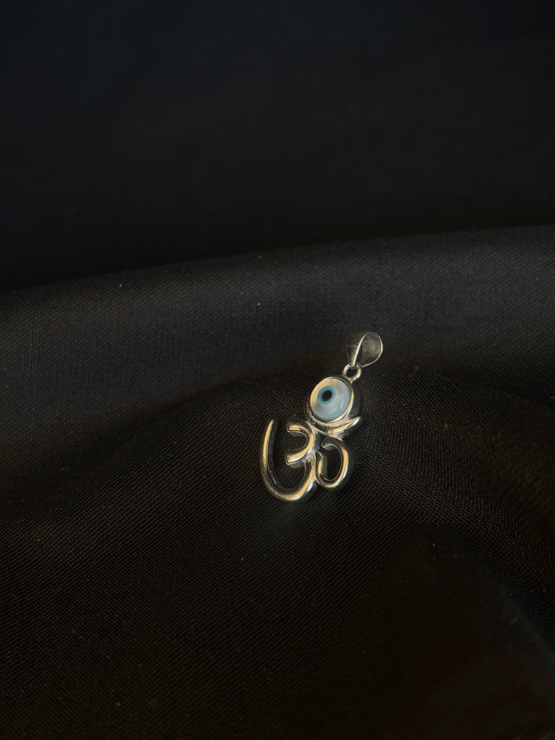 92.5 sterling silver Om pendant features a delicate evil eye charm, combining spiritual significance with protection against negativity. The elegant and minimalistic design makes it perfect for daily wear or as a thoughtful gift.
