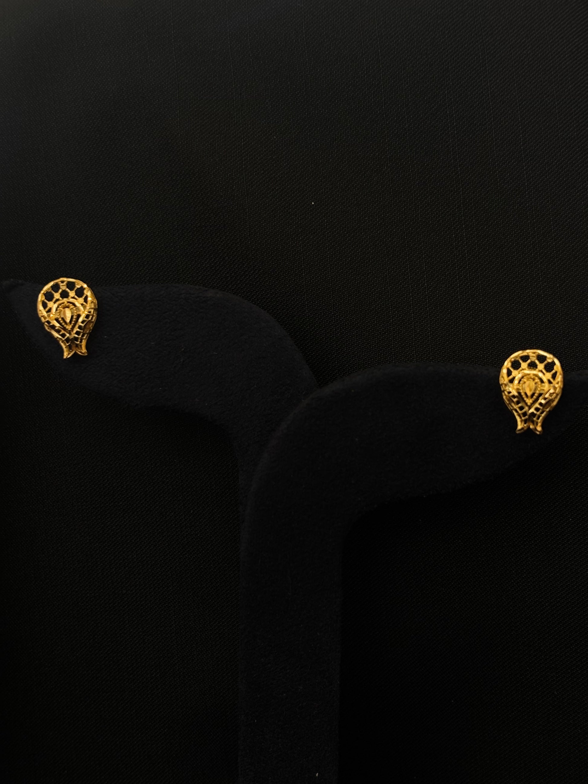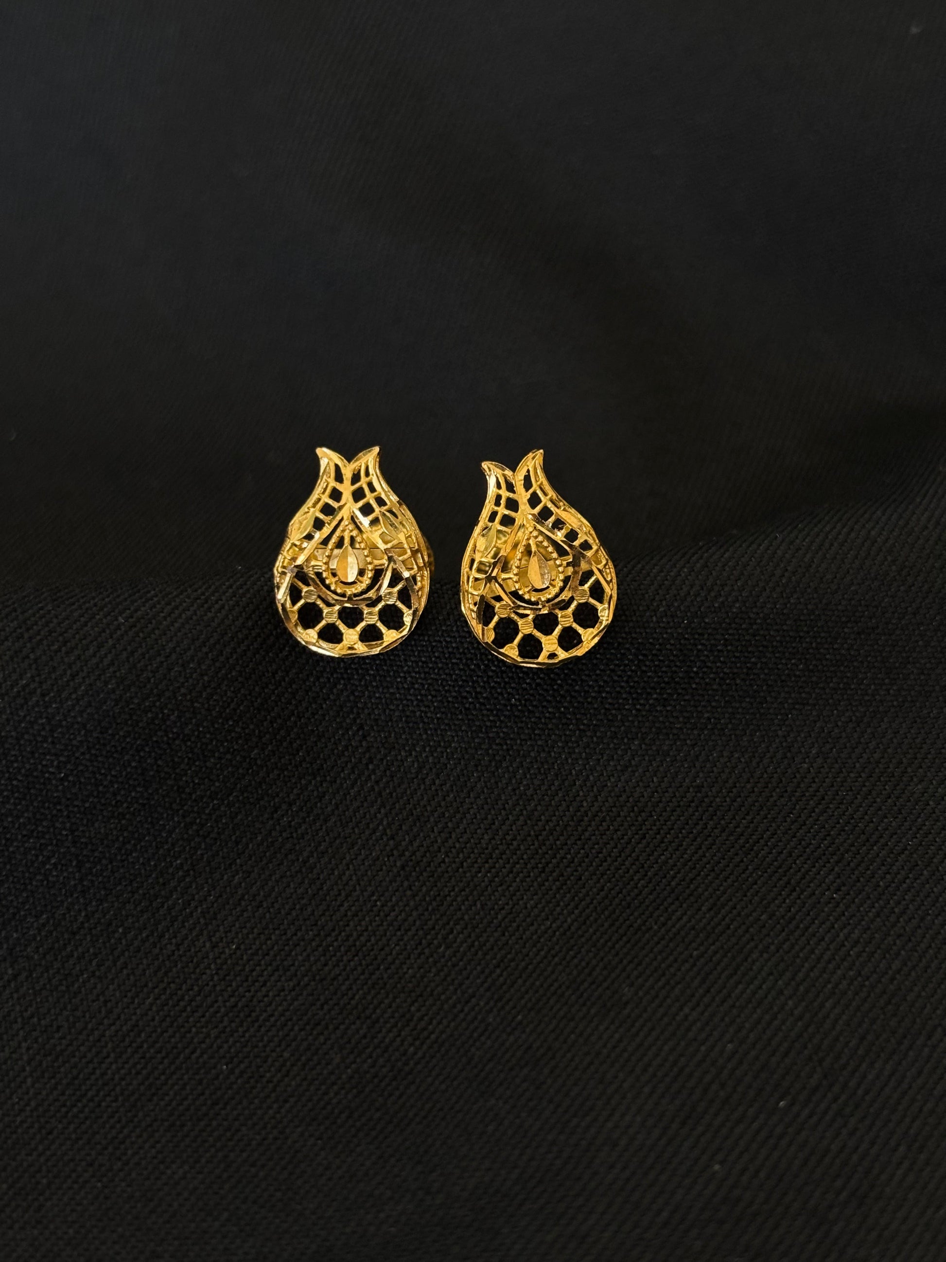 22K yellow gold stud earrings. Each earring features an intricate teardrop shape crafted with delicate filigree work, creating an openwork design with a captivating central accent. These elegant studs offer a touch of traditional artistry and radiant gold, perfect for any occasion.
