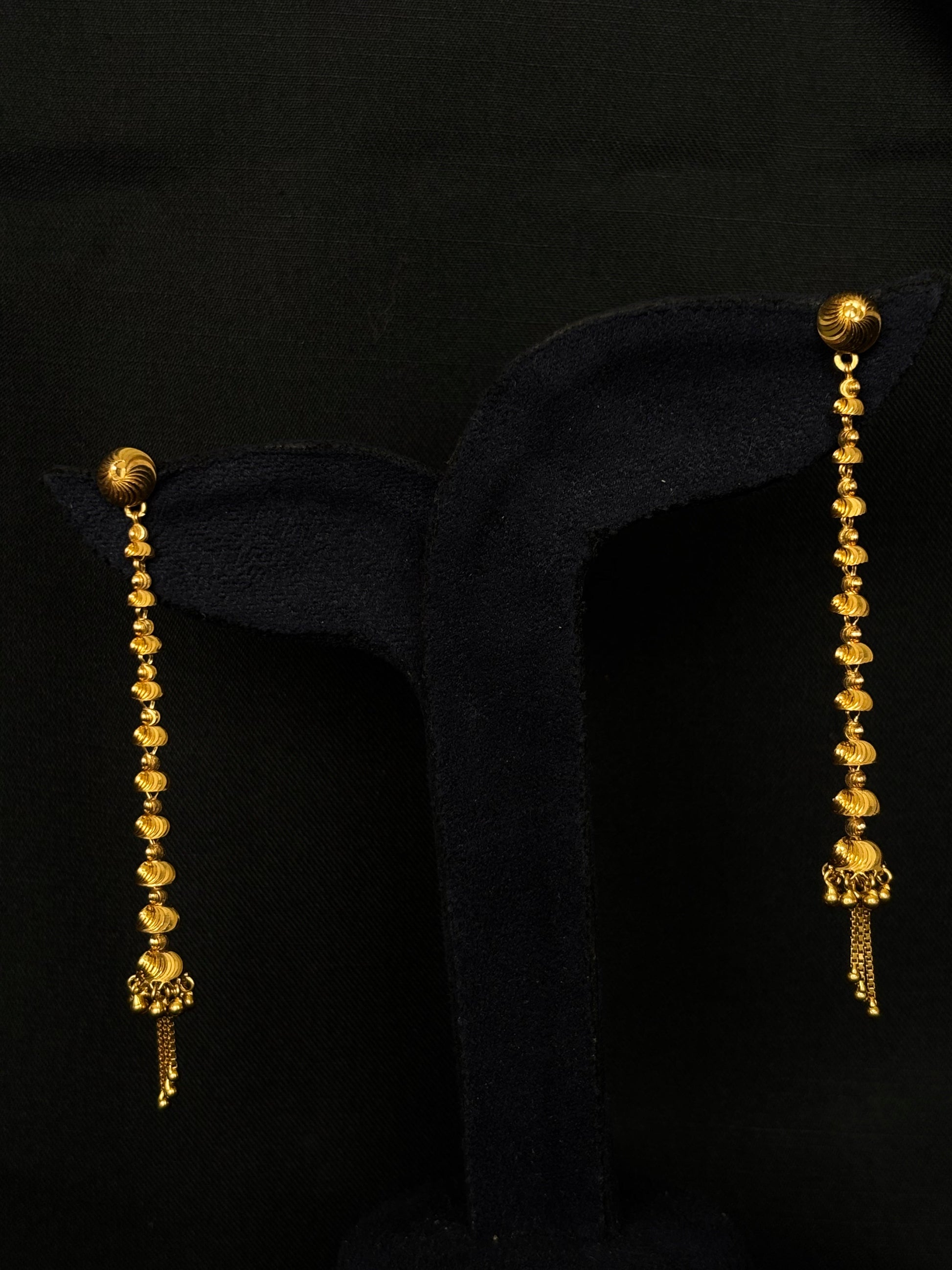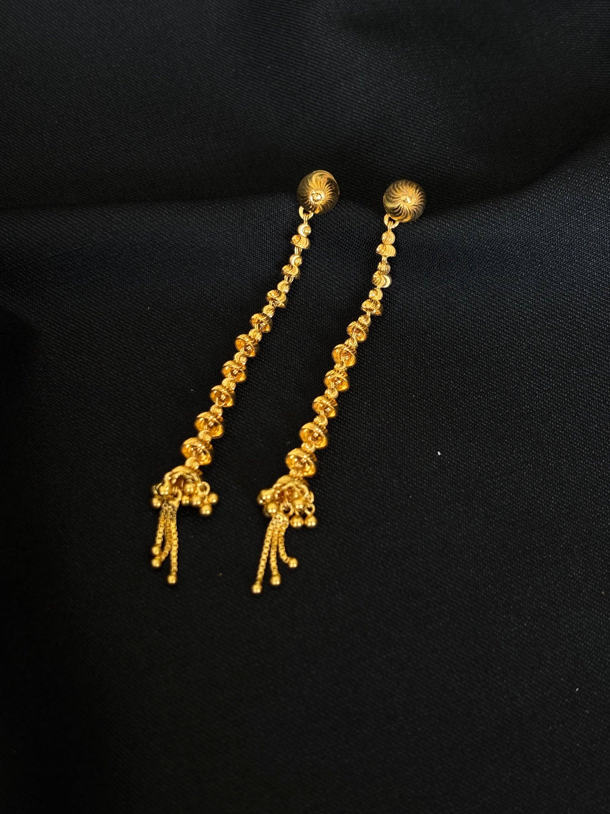 22K yellow gold long dangle earrings. Each earring features a series of beautifully textured gold beads or spirals cascading downwards, ending in delicate chain drops, creating a graceful and captivating movement. These radiant earrings are perfect for adding a touch of golden grandeur to any festive or celebratory occasion.