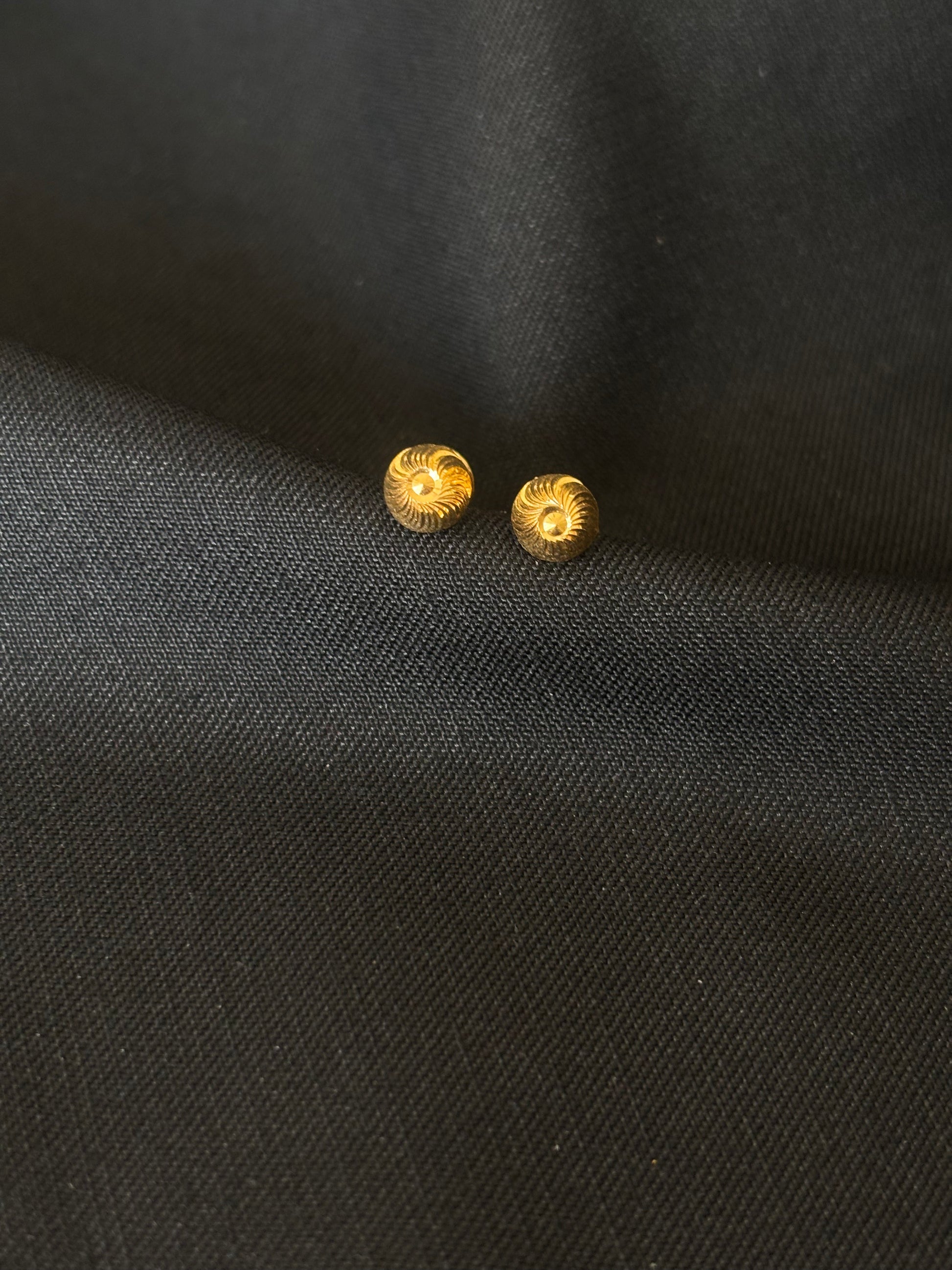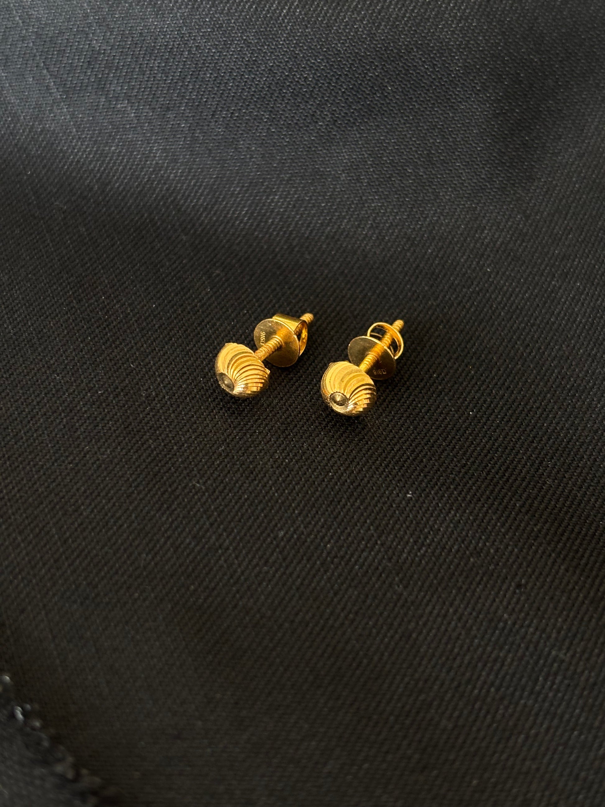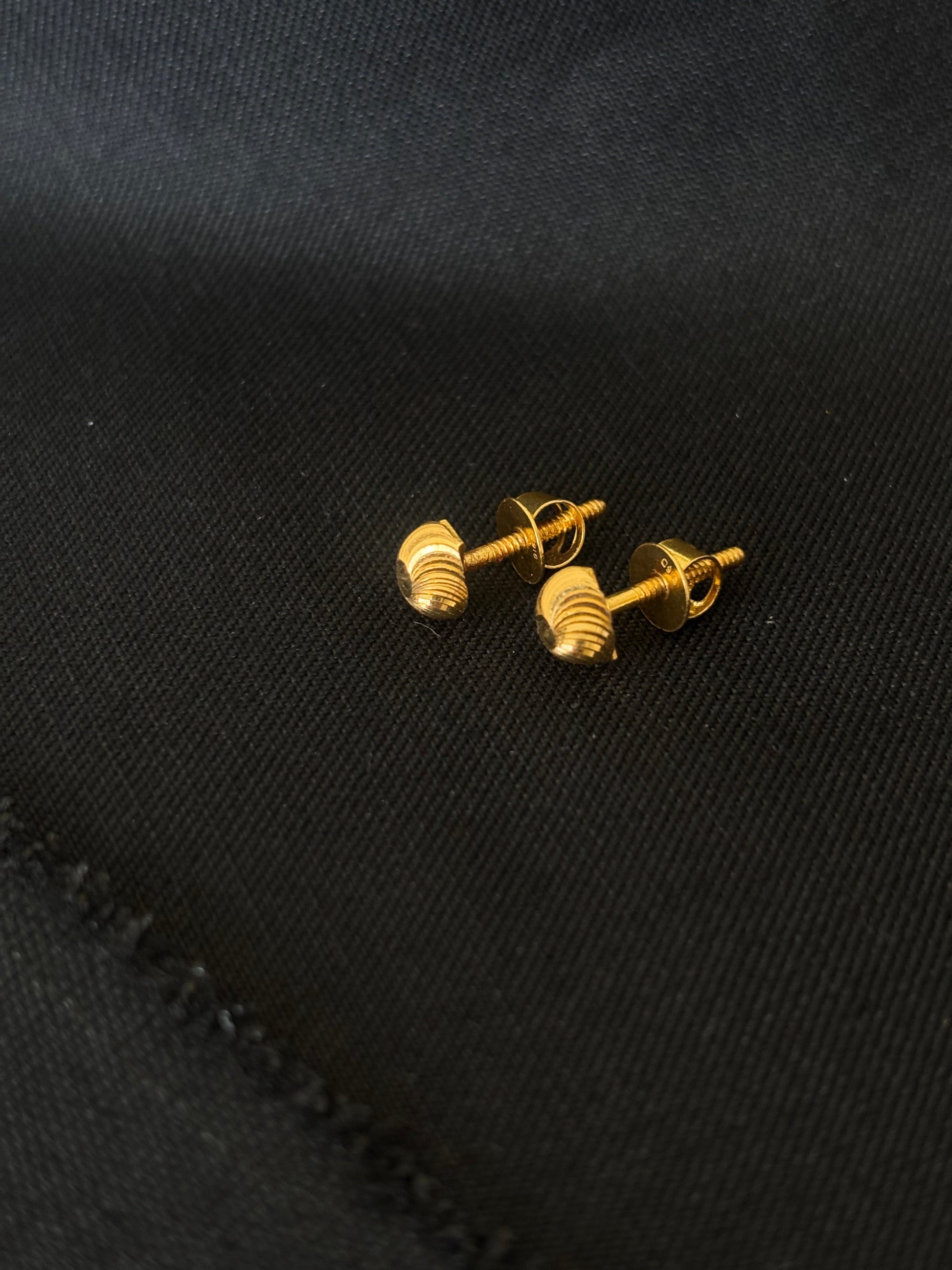 22K yellow gold stud earrings. Featuring a clean, modern design, possibly with a subtle texture or ridge on the cap, these versatile screw-back earrings offer comfortable and secure wear, perfect for everyday sophistication.